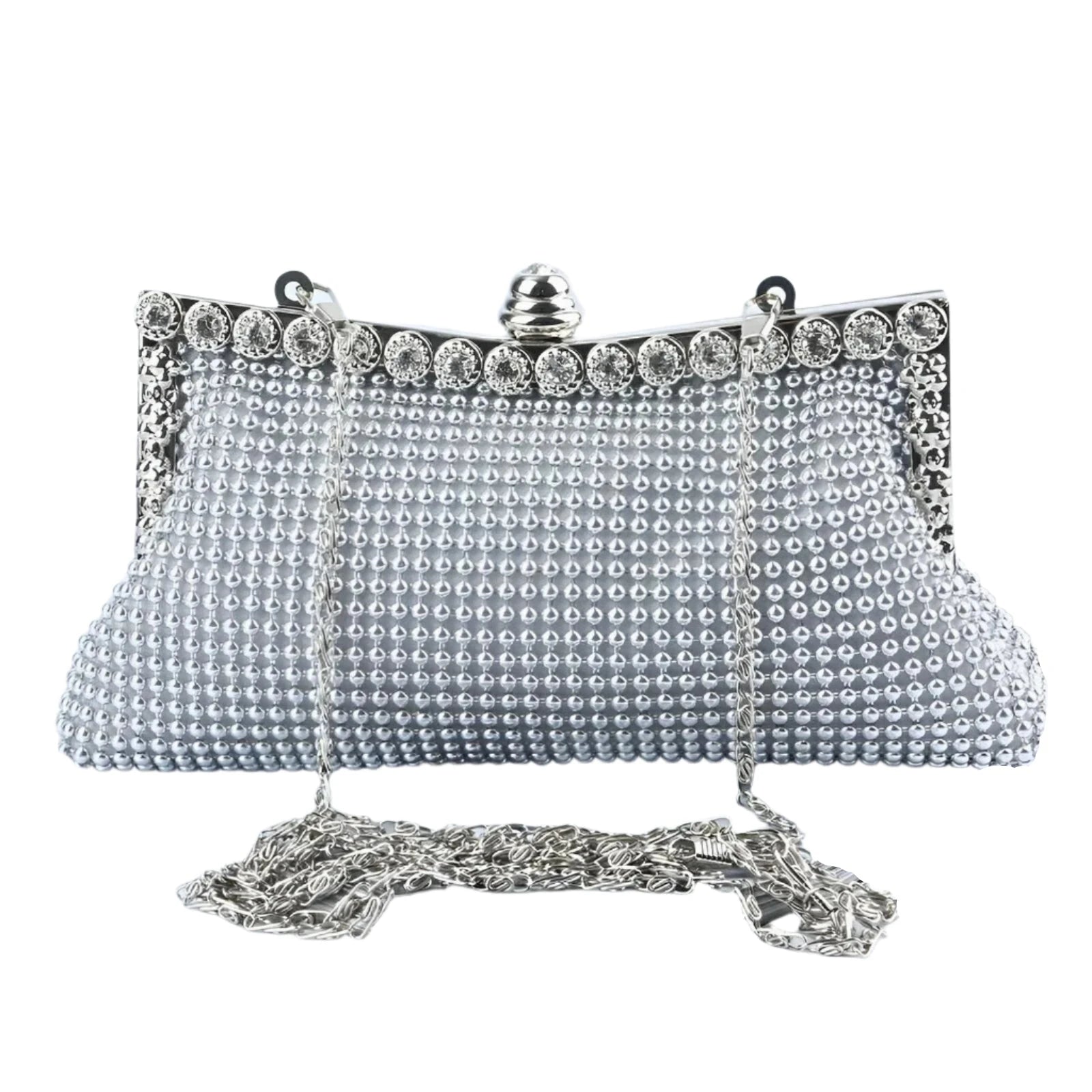 This elegant clutch features a luxurious design adorned with intricate rhinestone detailing for an eye-catching finish. A chainlink shoulder strap provides a stylish and functional touch, allowing for easy wearing, while the sleek clasp ensures secure carry. The overall design exudes a modern yet sophisticated charm, making it perfect for formal occasions or evening outings. Accentuate your ensemble.