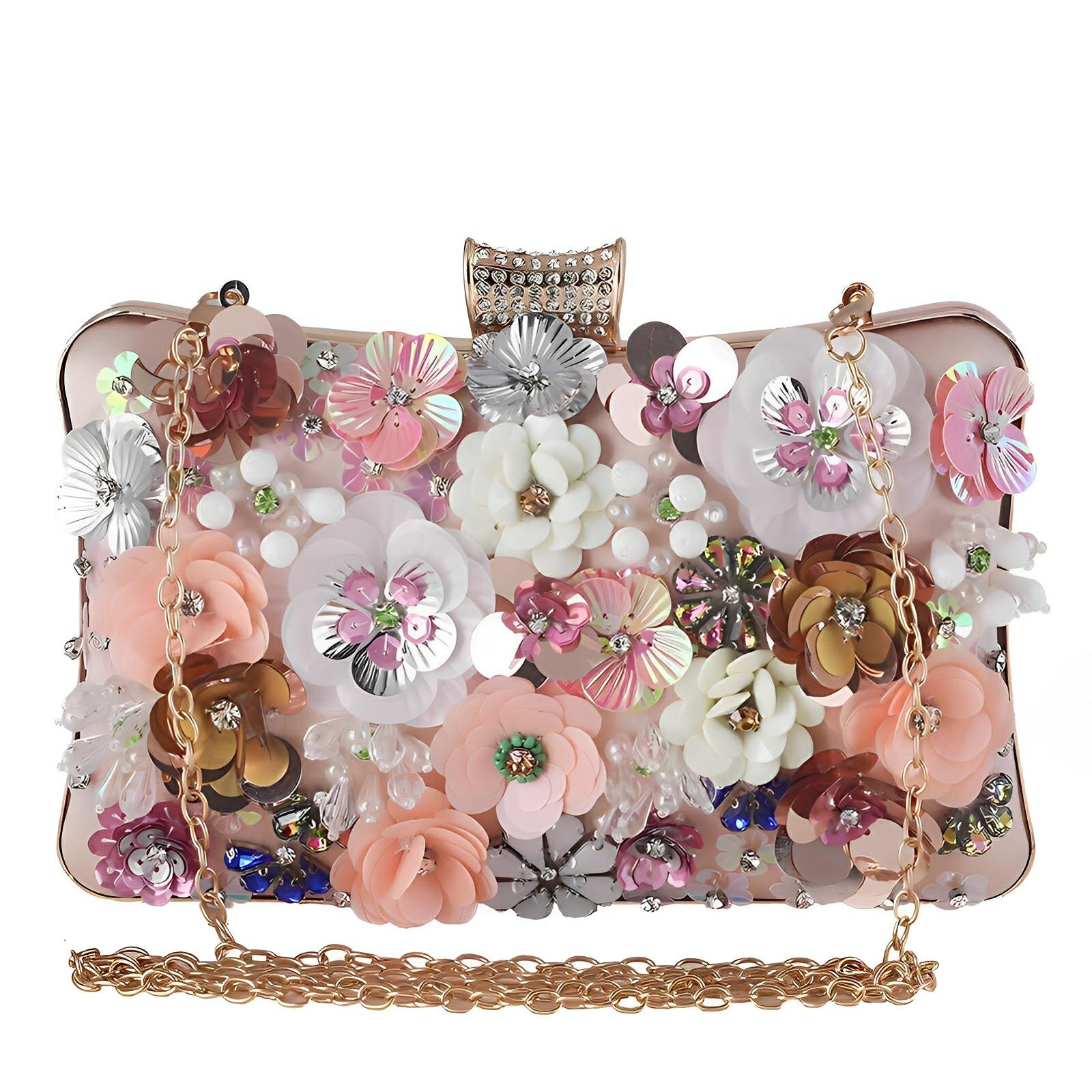 This stunning clutch features a lavish exterior crafted from premium materials, exuding a luxurious appearance. The design is accentuated by elaborate sequin florals, adding a touch of sophistication to the overall silhouette. This clutch is ideal for evening events or formal occasions, serving as a perfect accessory to complement elegant gowns or fashion-forward outfits. Be unforgettable.