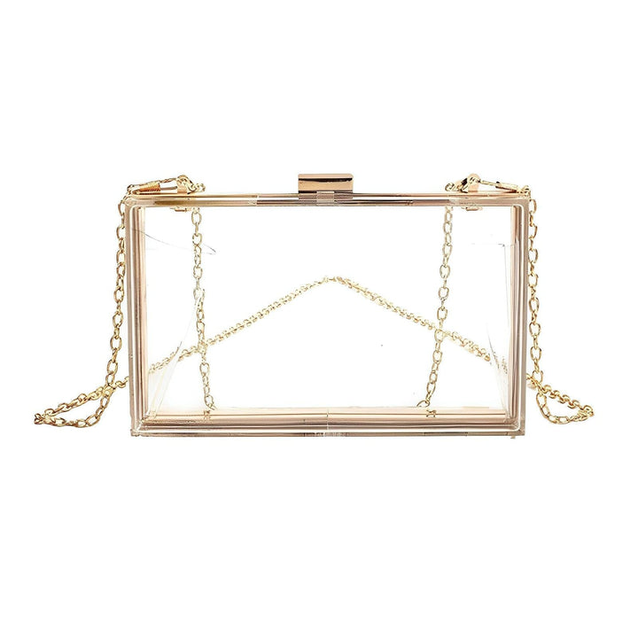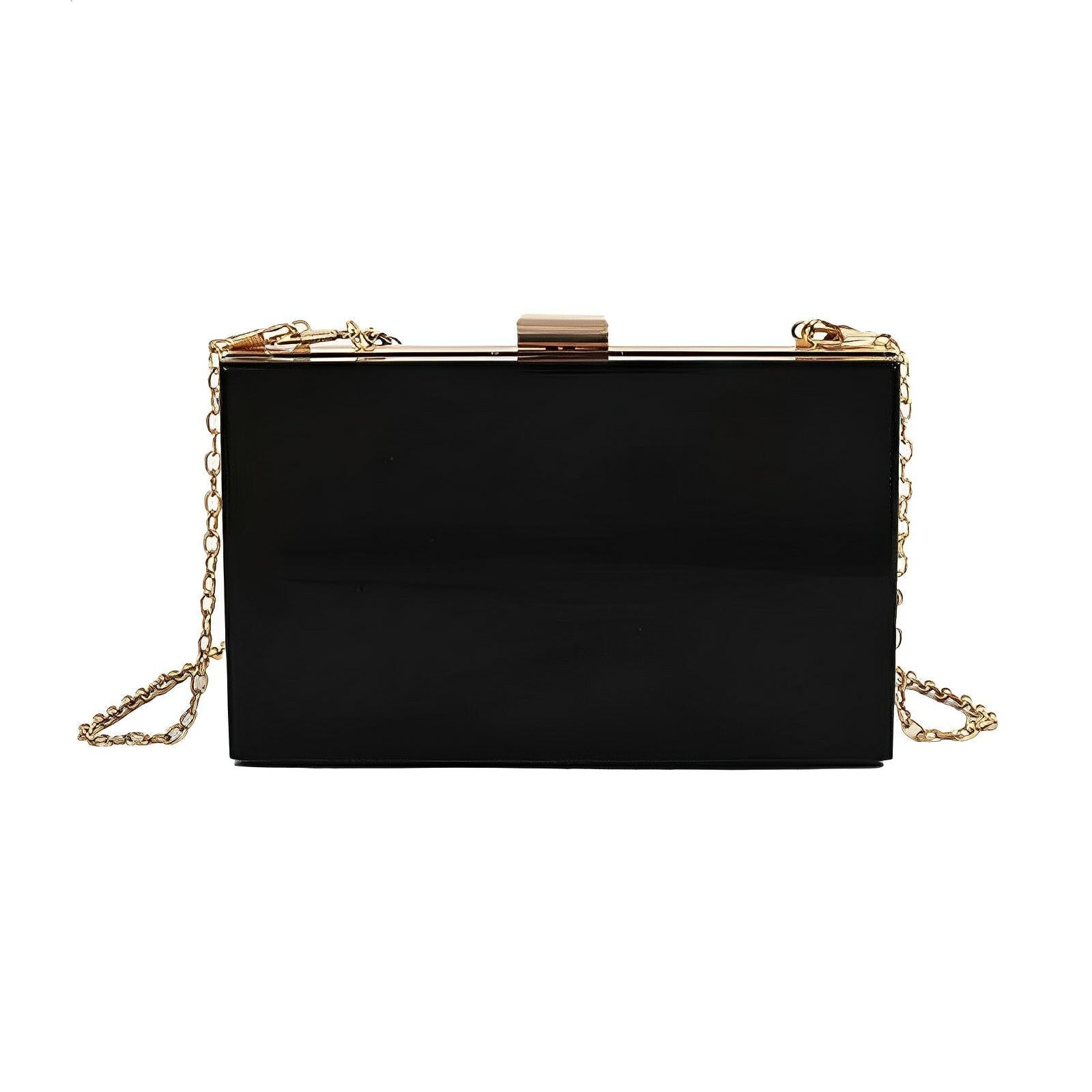 This minimalist clutch features a contemporary design adorned with intricate gold detailing for a luxurious finish. A chainlink shoulder strap provides a stylish and functional touch, allowing for easy wearing, while the sleek clasp ensures secure carry. The overall design exudes a modern yet sophisticated charm, making it perfect for casual occasions or evening outings. Accessorize your look.