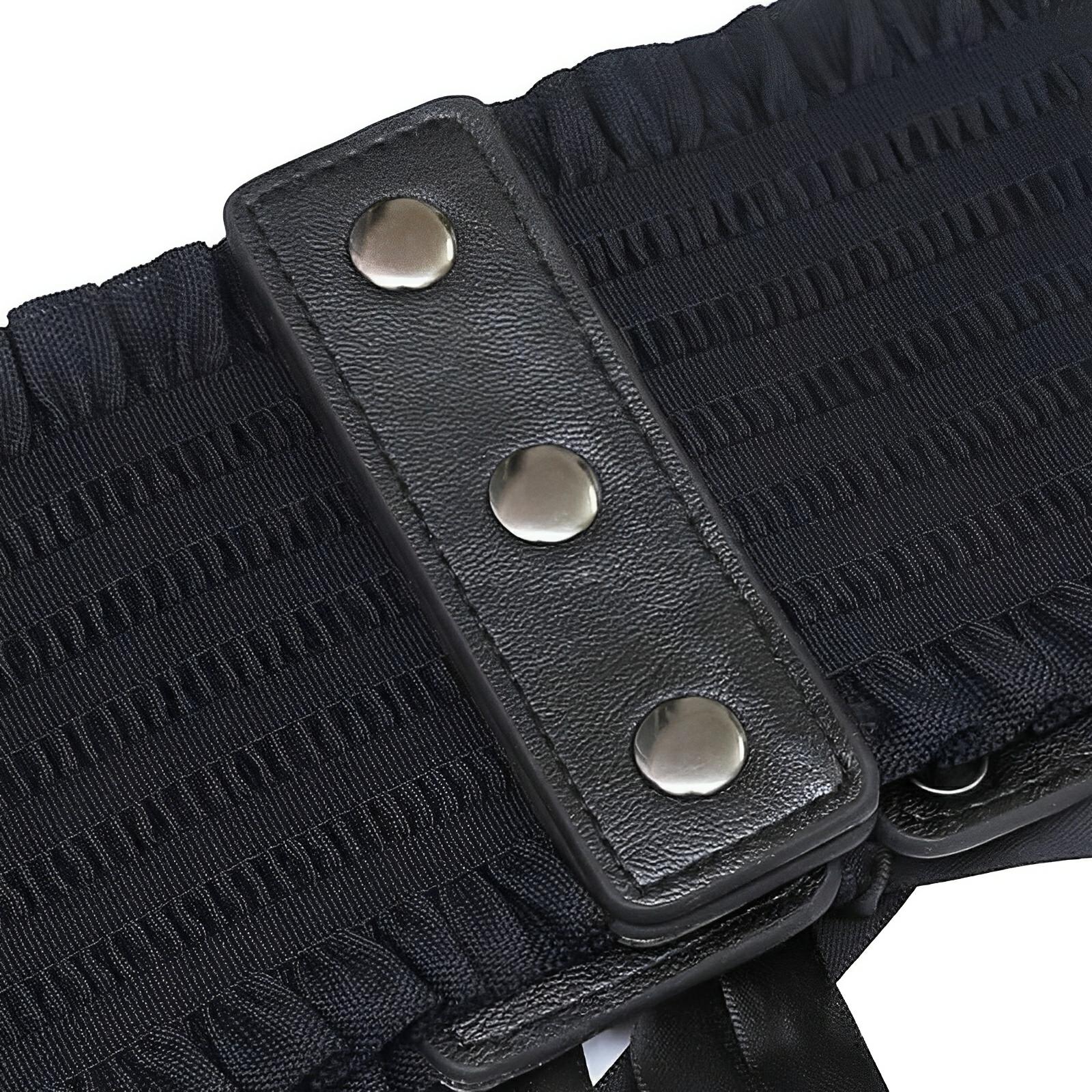 This bold statement belt is designed with a wide width, lending a dramatic flair to any outfit. The belt features intricate detailing, adding to the contemporary aesthetic of the piece. Made from a smooth material, it is suitable for adding an edgy touch to both casual and stylish ensembles.
