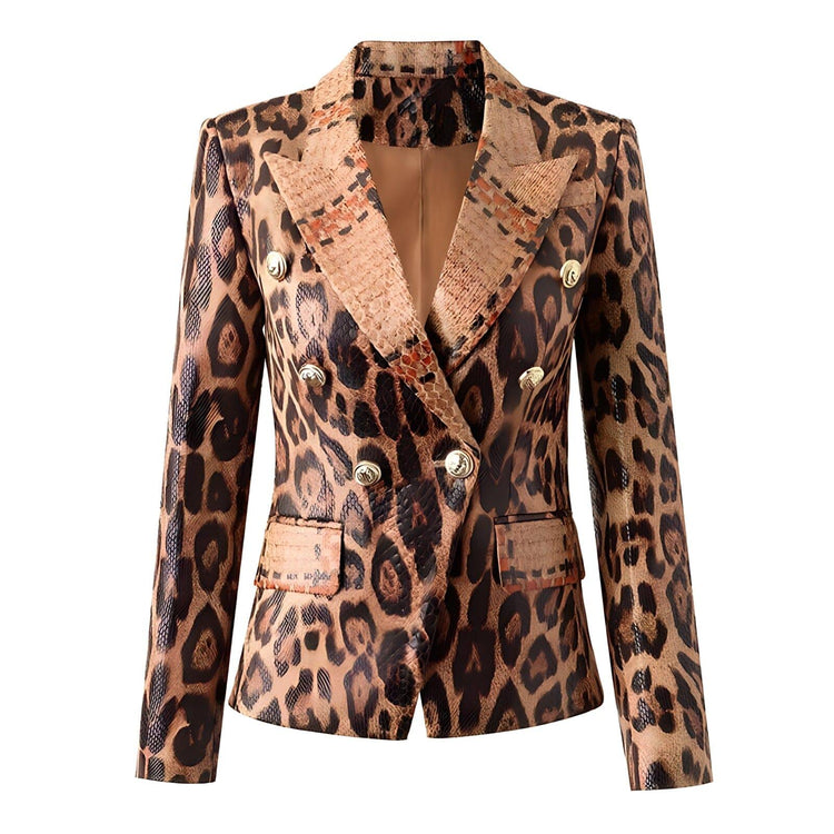 This stylish double-breasted blazer features an eye-catching exterior, showcasing a mix of smooth and textured fabric that adds depth. The blazer has a classic lapel design, embellished with polished buttons that enhance its luxurious appeal. The sharp, tailored fit emphasizes a sophisticated silhouette, making it suitable for both formal and casual occasions. Leave a lasting impression.