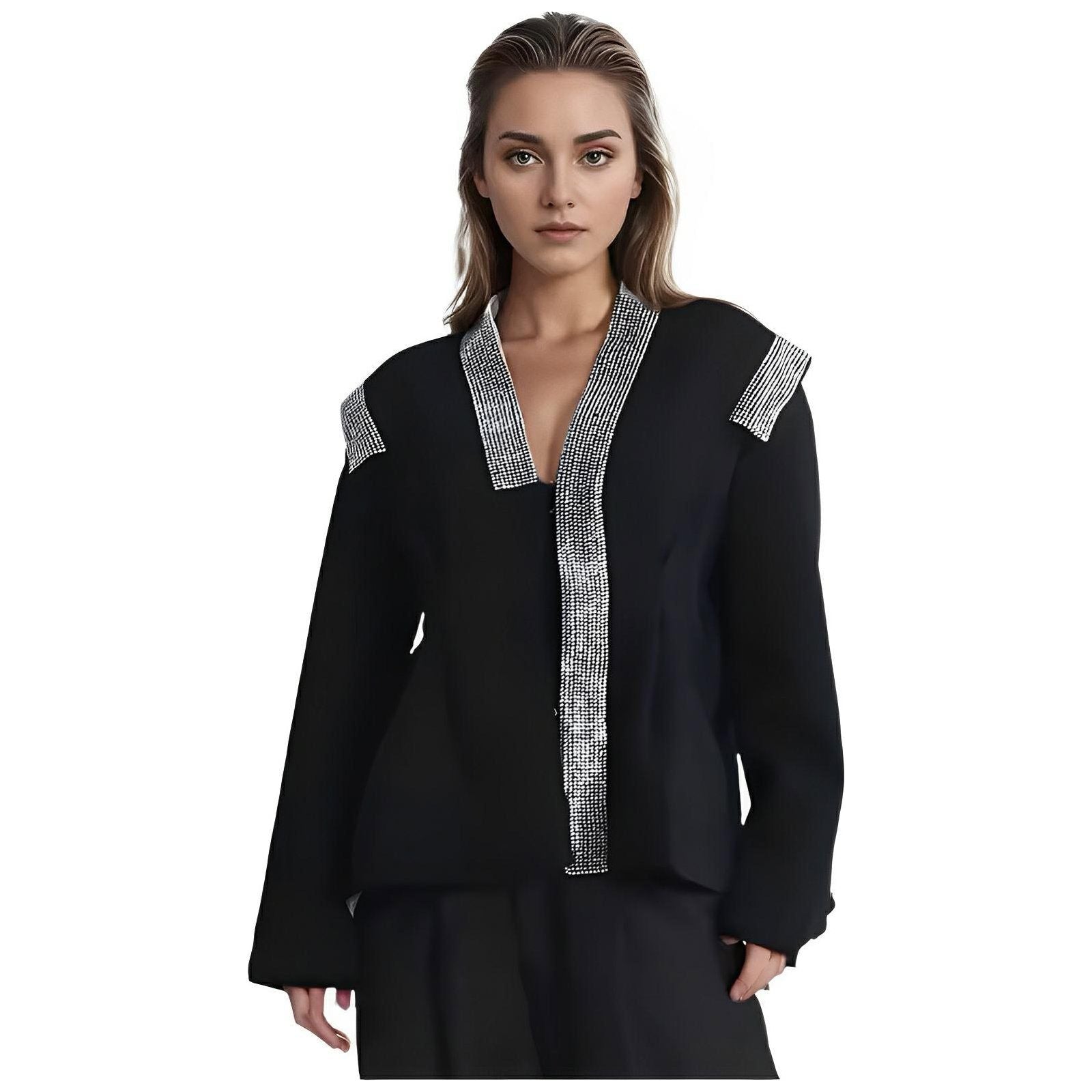 This stylish blazer features a modern and edgy design, characterized by a tailored, relaxed fit and open-flow front. The blazer has a sleek open neck, and sequin-embellished lapels, enhancing its luxurious appeal. It presents a contemporary silhouette that flatters the figure, making it ideal for both formal and fashion-forward occasions. The overall look balances sophistication with a touch of avant-garde flair. Be exclusive.