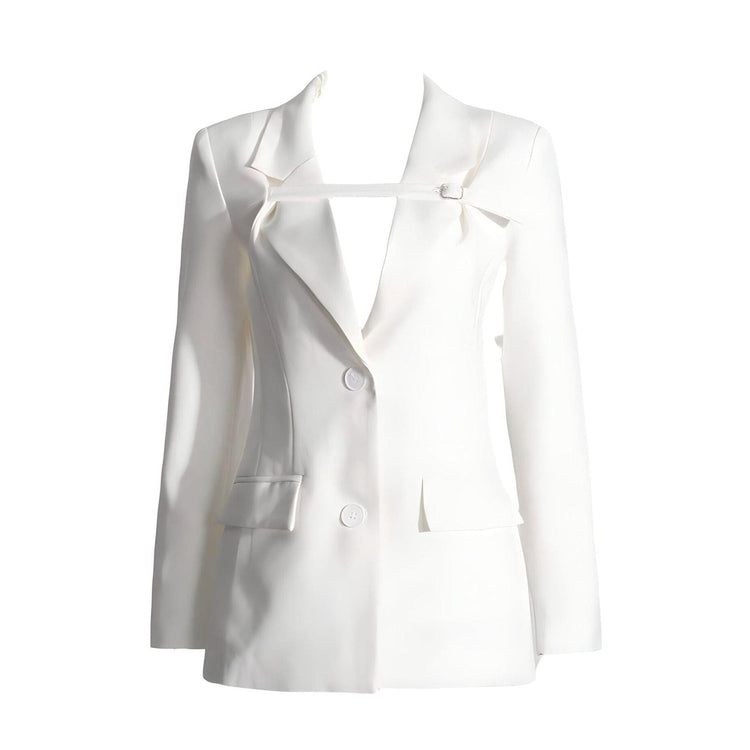 This stylish blazer features a modern and edgy design, characterized by a tailored fit and double-breasted front. The blazer has a sleek, open neck and notched lapels, enhancing its contemporary appeal. It presents a fitted silhouette that flatters the figure, making it ideal for both formal and semi-formal occasions. The overall look balances sophistication with a touch of avant-garde flair. Be exclusive.