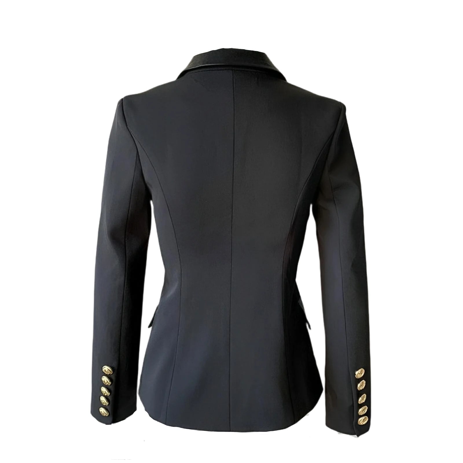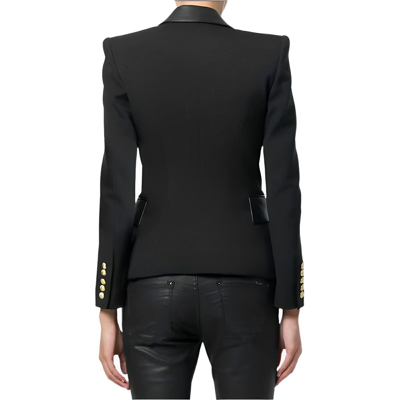 This stylish double-breasted blazer features a luxurious exterior, showcasing a mix of smooth and textured fabric that adds depth. The blazer has a faux leather lapel, and the body is adorned with polished gold buttons that enhance its elegant appeal. The sharp, tailored fit emphasizes a sophisticated silhouette, making it suitable for both formal and casual occasions. Leave a lasting impression.