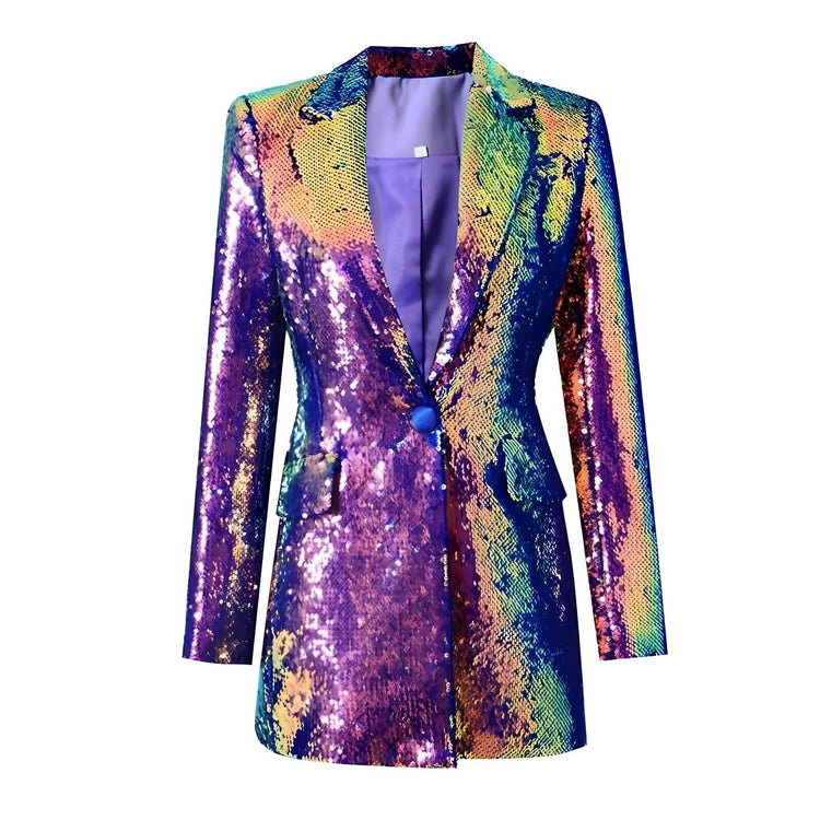 This stunning blazer features a smooth surface adorned with shimmering sequins, creating a striking visual effect. It has a sharp lapel that elegantly compliments the sequined body, offering a sophisticated flair. This versatile piece is perfect for formal events or nights out, ensuring a standout look with its luxurious details. Be remembered.