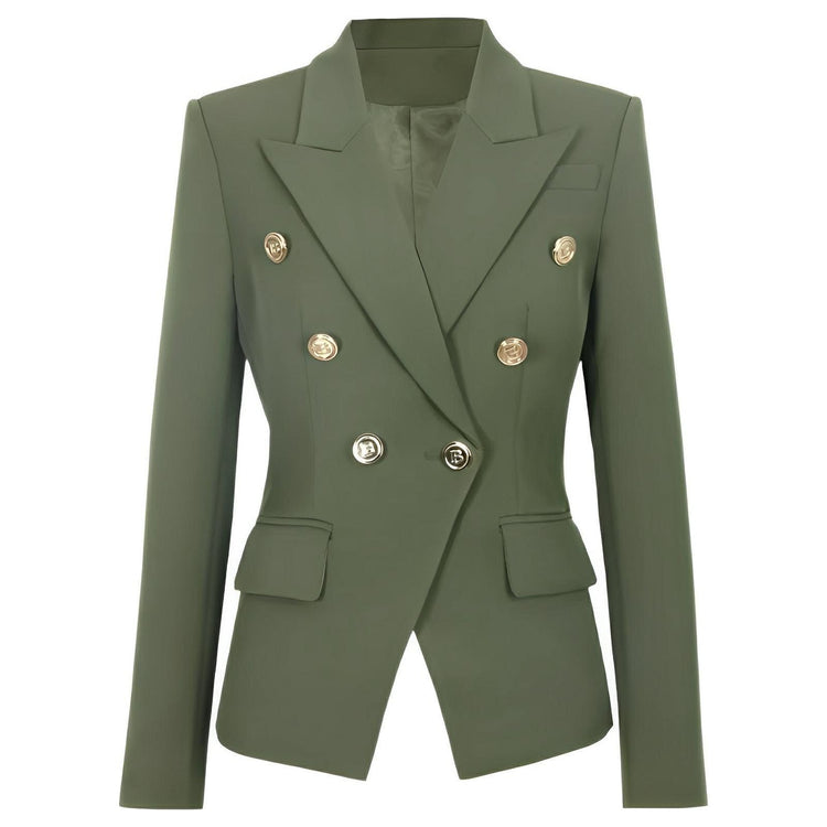 This tailored double-breasted blazer features a classic lapel collar, and is adorned with polished metal buttons, exuding a sophisticated aesthetic. The fit is structured, providing a flattering shape that can be dressed up for formal occasions or down for a smart-casual look. Command attention.
