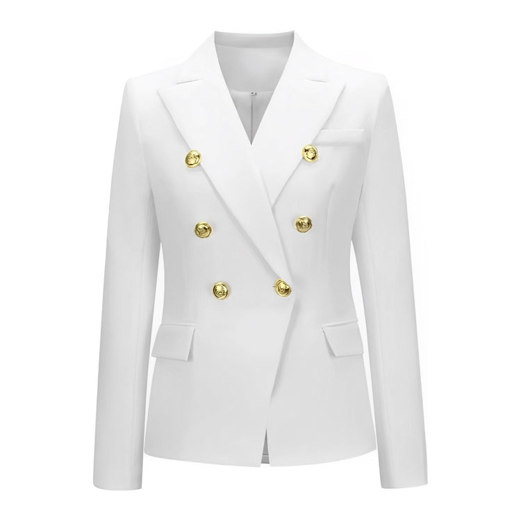 This tailored double-breasted blazer features a classic lapel collar, and is adorned with polished metal buttons, exuding a sophisticated aesthetic. The fit is structured, providing a flattering shape that can be dressed up for formal occasions or down for a smart-casual look. Command attention.