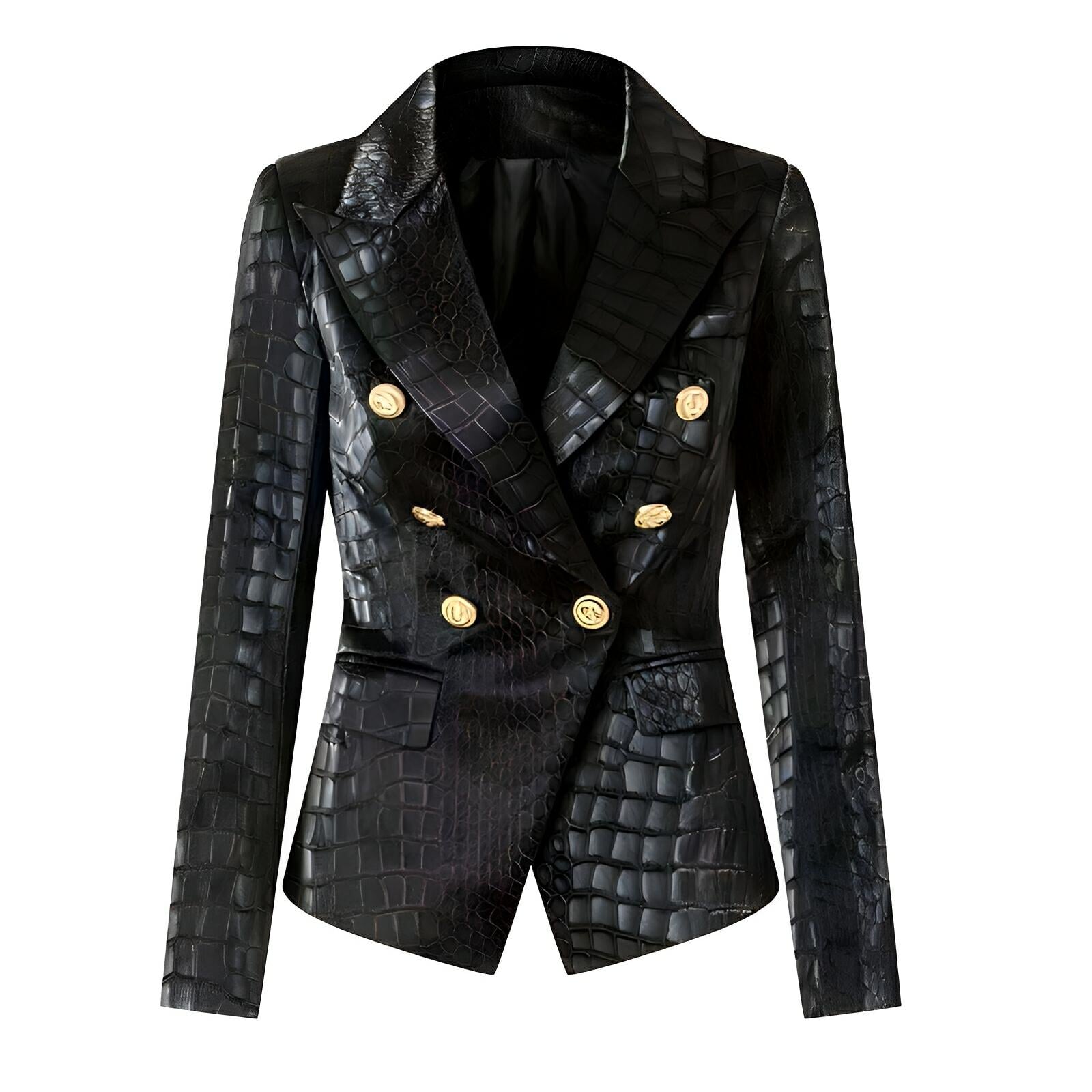 This stylish double-breasted blazer features an eye-catching exterior, showcasing a mix of smooth and textured fabric that adds depth. The blazer has a classic lapel, and the faux leather body is embellished with polished buttons that enhance its luxurious appeal. The sharp, tailored fit emphasizes a sophisticated silhouette, making it suitable for both formal and casual occasions. Leave a lasting impression.