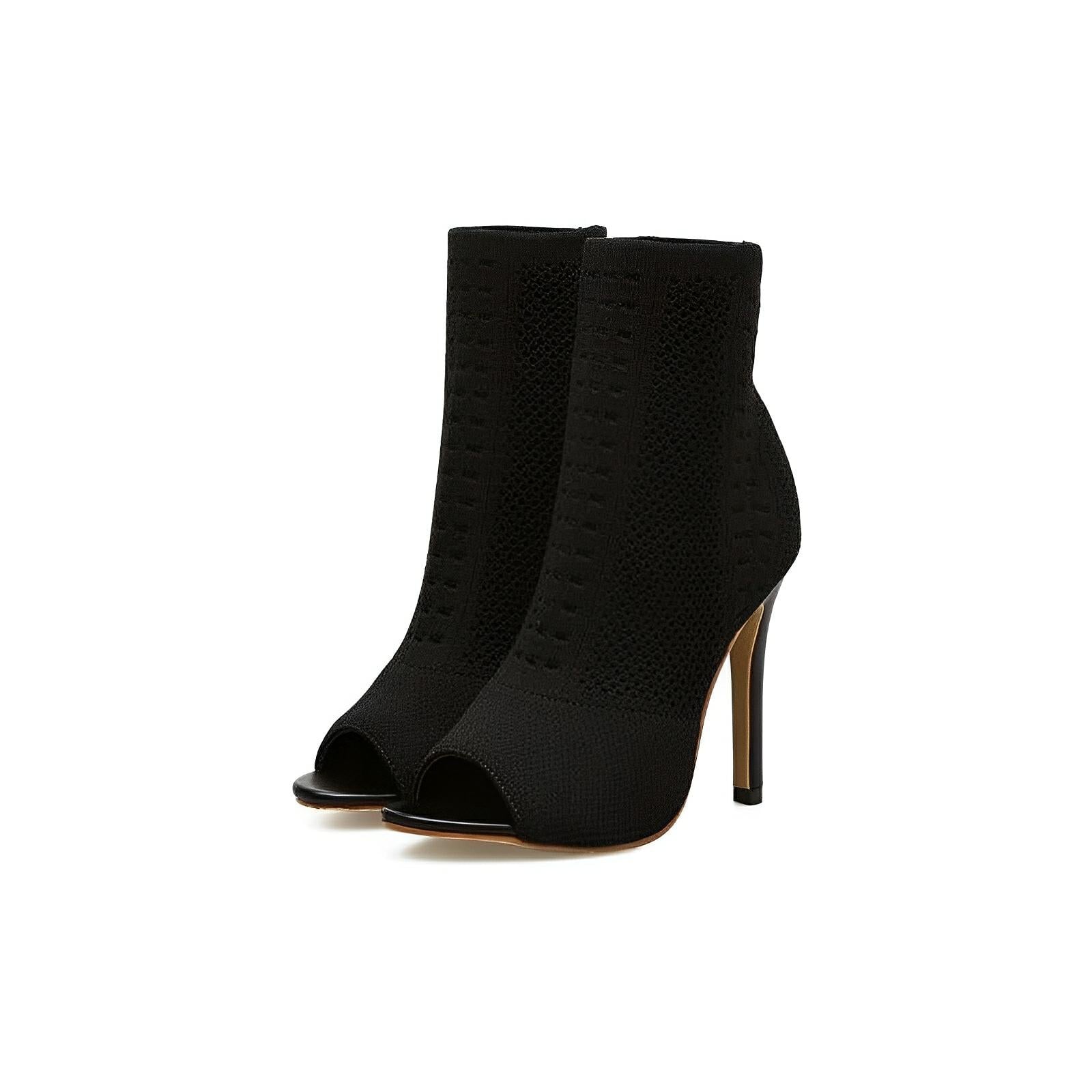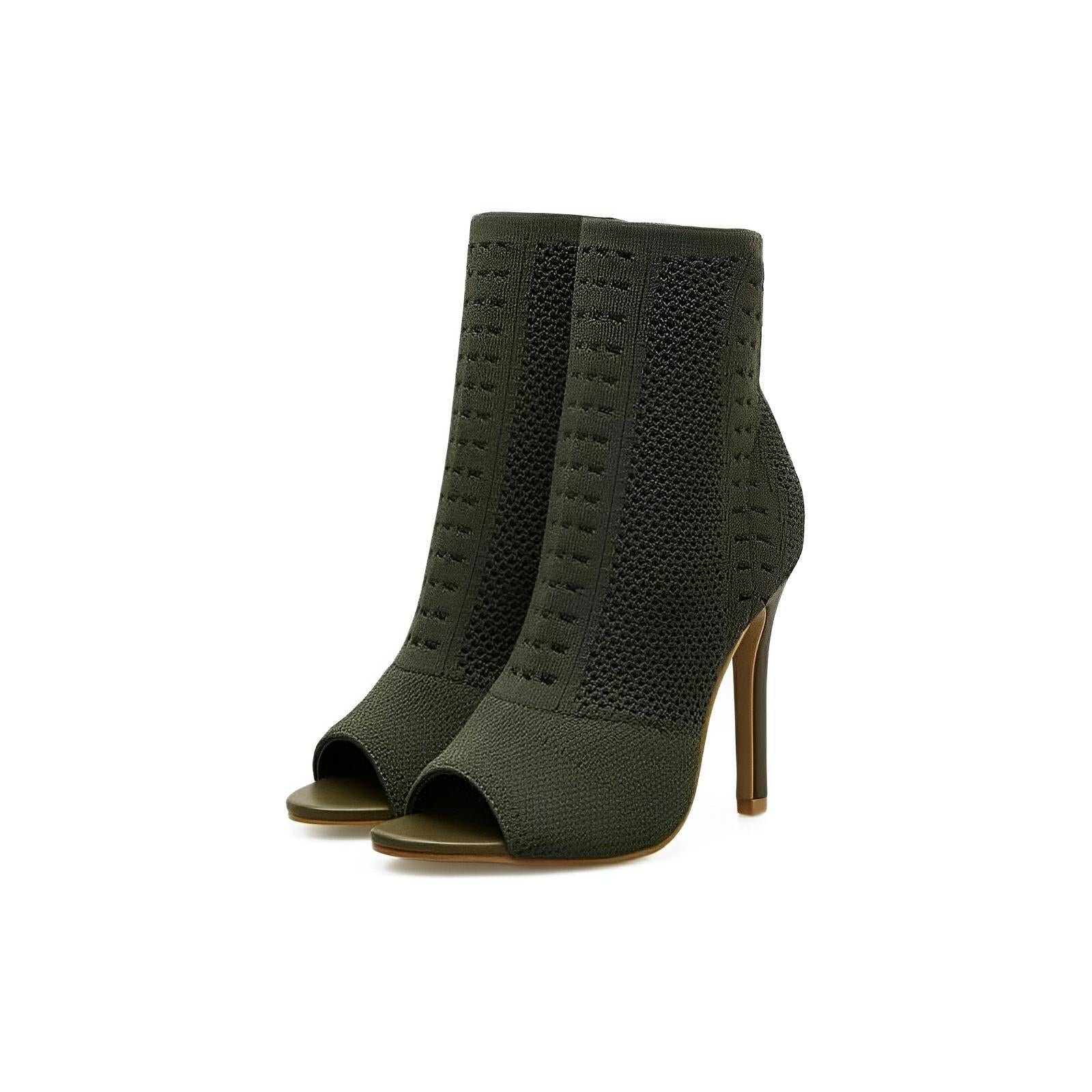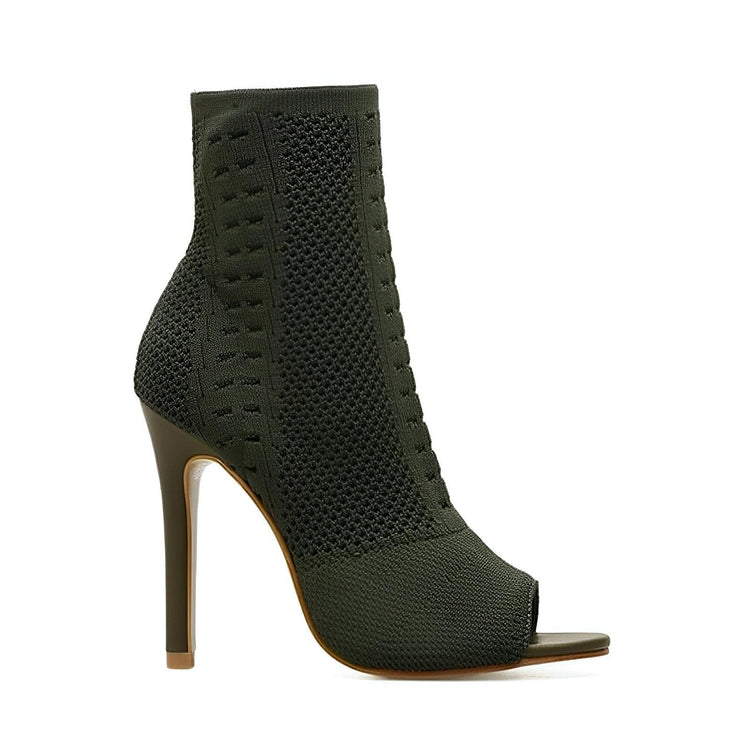 This knitted ankle boot features an open toe, and a sleek, fitted silhouette. The boot has a stiletto heel with a sophisticated outline, providing modern flair while maintaining stability. This luxurious footwear choice is perfect for making a statement in both casual and formal settings. Own every moment.