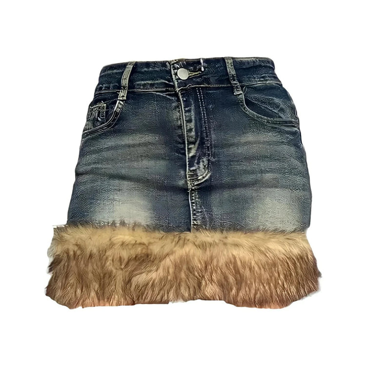 This fur-lined denim skirt features a high-waisted design with a classic, fitted silhouette. The skirt is adorned with a button closure and a zipper fly, along with traditional five-pocket construction, ensuring both functionality and style. The skirt's overall length is short, accentuating the legs and offering a chic, youthful look. Make a statement.