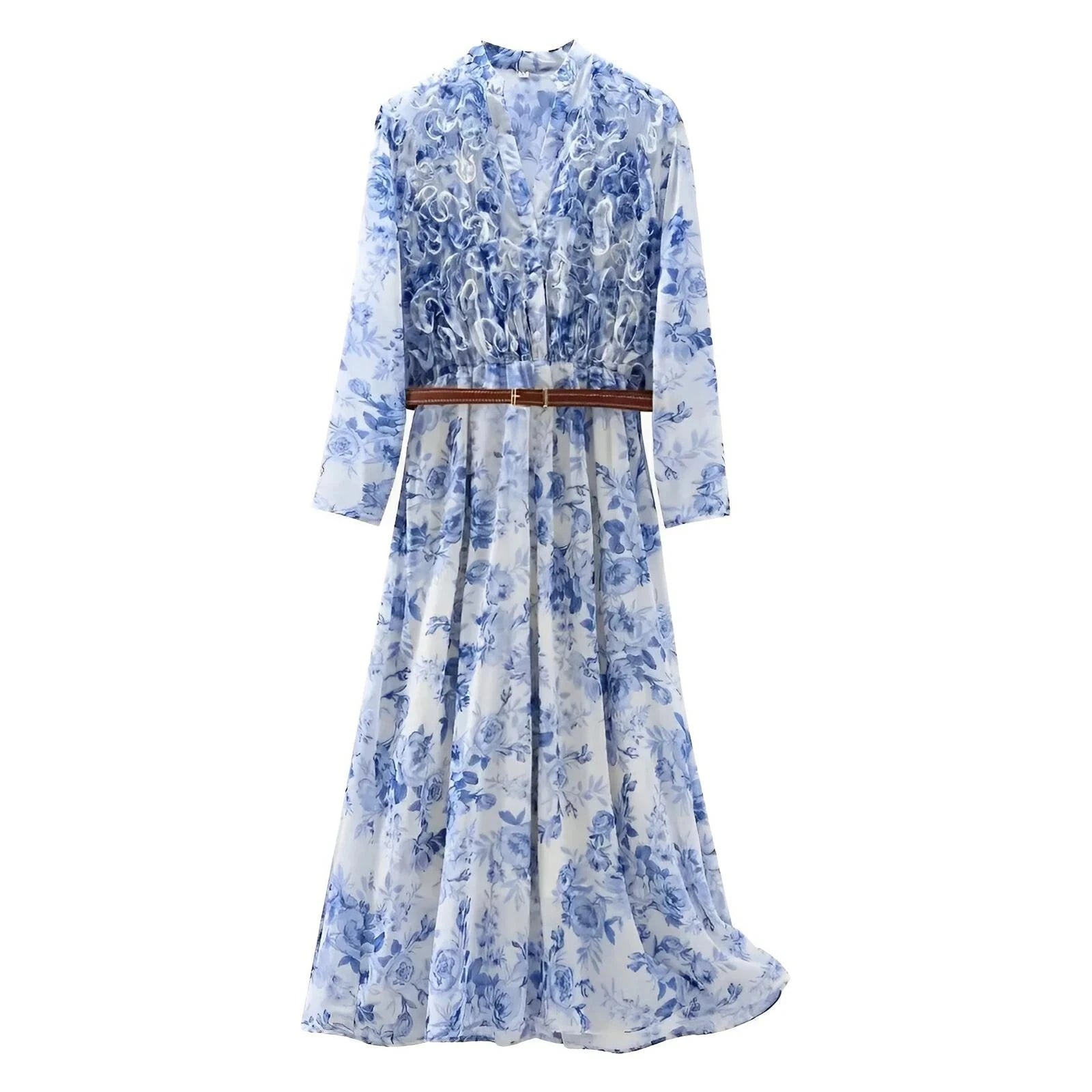 This boho long-sleeve dress offers a soft and versatile foundation for various occasions. The skirt flows gracefully, with an accent waist belt adding depth to the overall design. Ideal for casual outings or semi-formal events, this dress effortlessly combines style with comfort. Make a statement.