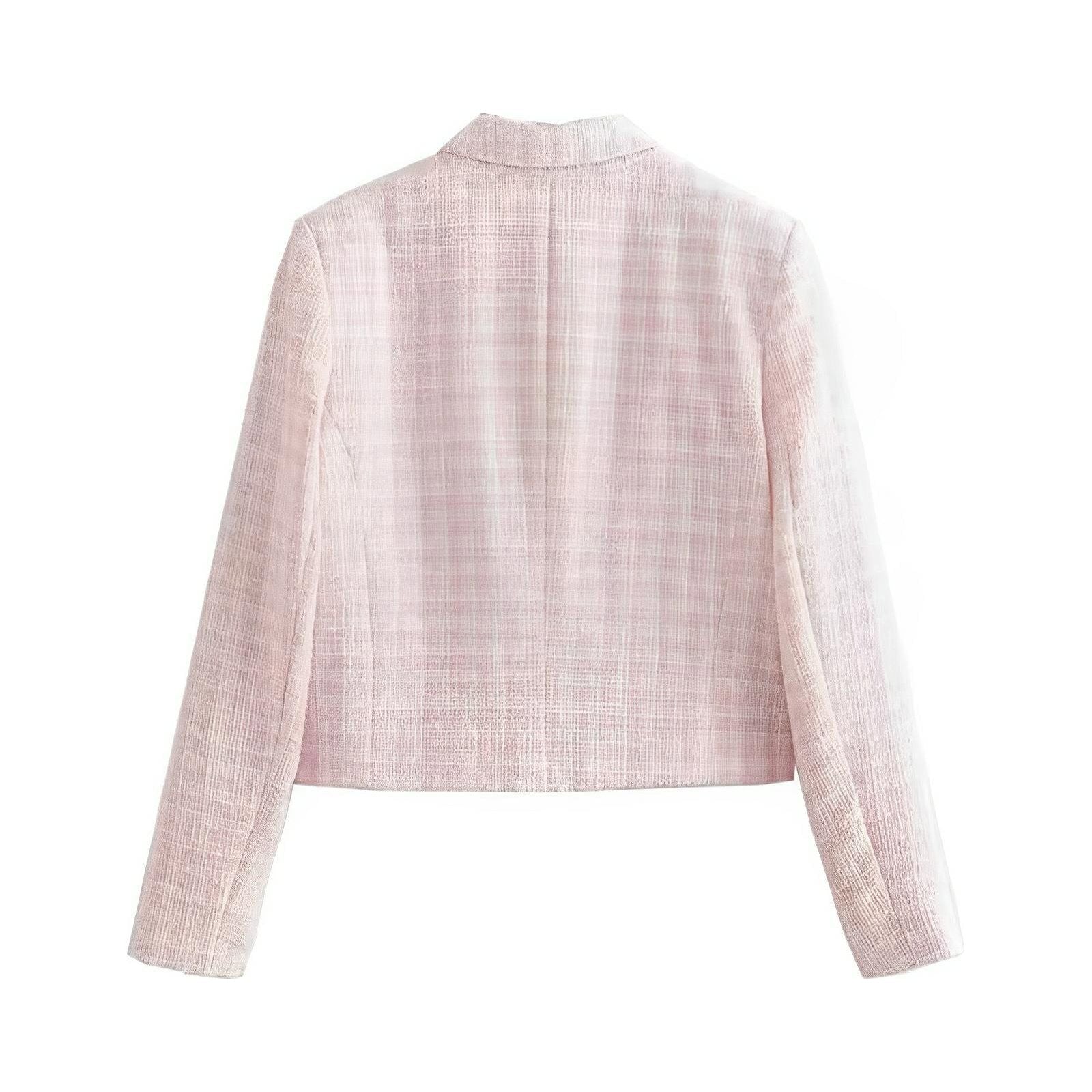 This luxurious jacket features subtle tweed detailing that combines elegance with a contemporary flair. It has a stylish collar and is designed with a cropped hem, adding a touch of modern sophistication. The jacket has tailored long sleeves, providing a structured silhouette that is perfect for both casual and semi-formal occasions. Command presence.