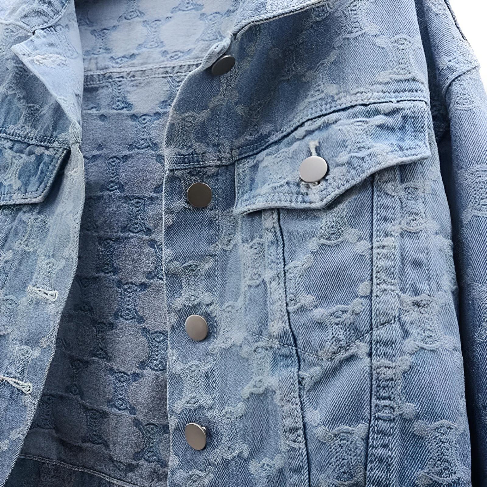 This chic jacket is crafted from a premium denim fabric, showcasing a subtle tonal patern with a slightly faded finish, giving it a vintage-inspired appeal. It has a front button closure with metallic buttons and tailored seams, enhancing its structured silhouette. The cropped length adds a contemporary flair, making it ideal for casual or semi-formal occasions. Make a statement.