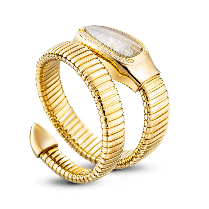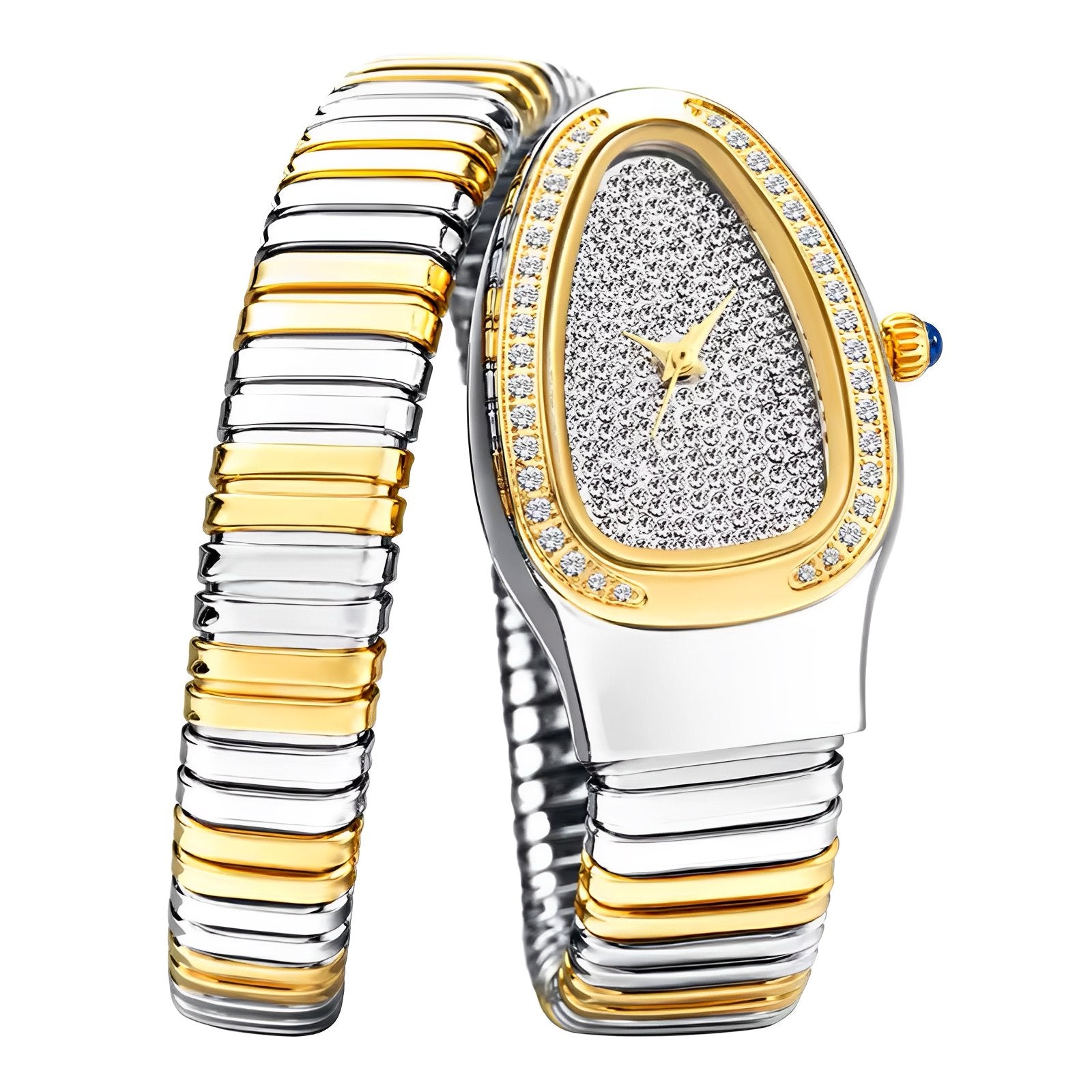This striking timepiece features a unique, wrapped 'snake' design adorned with shimmering stones, providing glamorous appeal. Ideal for special occasions or as a statement piece in casual wear, this watch combines artistry and sophistication, making it a captivating addition to any collection. Own your allure.