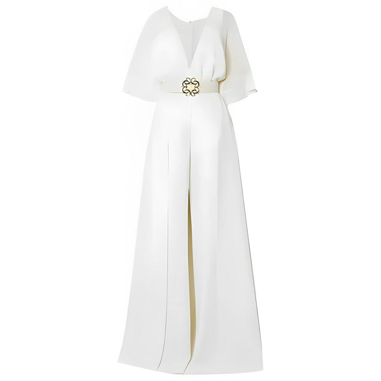 This belted jumpsuit features a structured silhouette with a streamlined fit, exuding effortless sophistication. The design incorporates a premium blend of luxurious fabrics, while the fitted bodice seamlessly transitions into wide-leg trousers that elongate the legs. The overall aesthetic is both modern and chic, making it ideal for formal or fashion-forward occasions. Make your presence known.