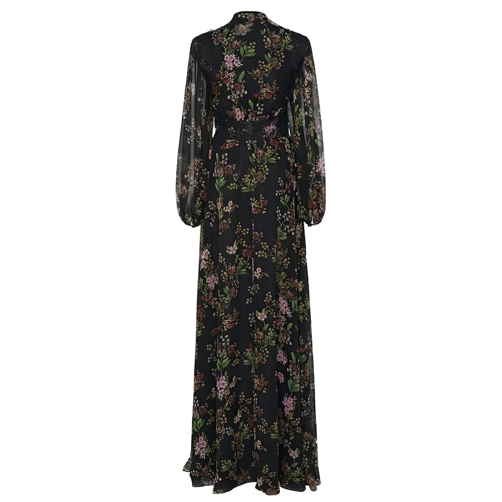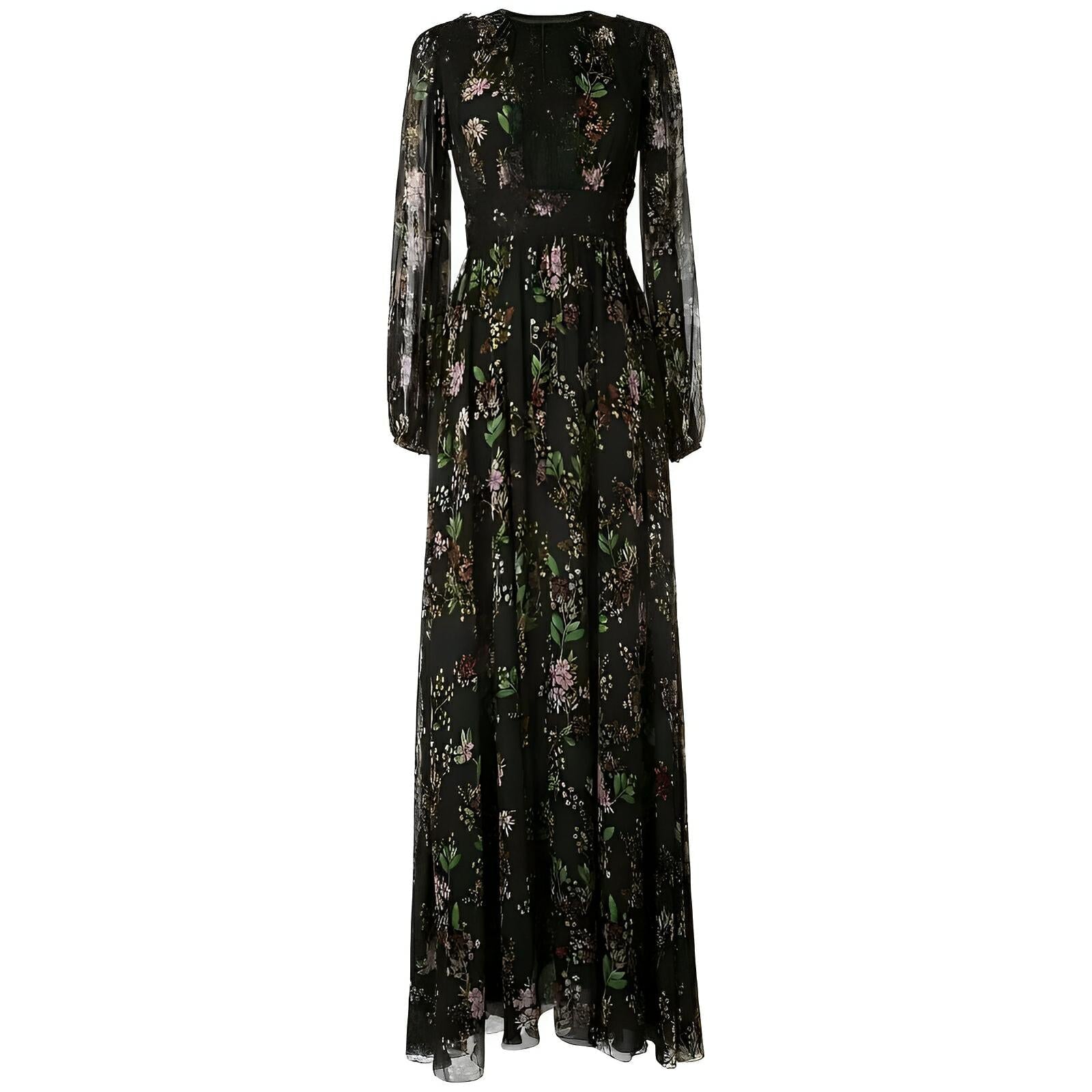 This stunning maxi dress features luxurious floral detailing set against soft and flowing fabric. The fitted waist accentuates the curves, elegantly defining the silhouette. The graceful floor-length hem completes the dress's refined and feminine aesthetic, making it suitable for formal events or special occasions. Own the moment.