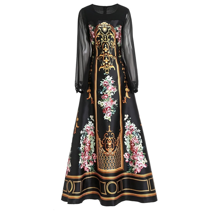 This elegant gown features sophisticated mesh detailing set against soft and flowing fabric. The fitted waist accentuates the curves, elegantly defining the silhouette. The graceful floor-length hem completes the dress's refined and feminine aesthetic, making it perfect for formal events or special occasions. Own the moment.