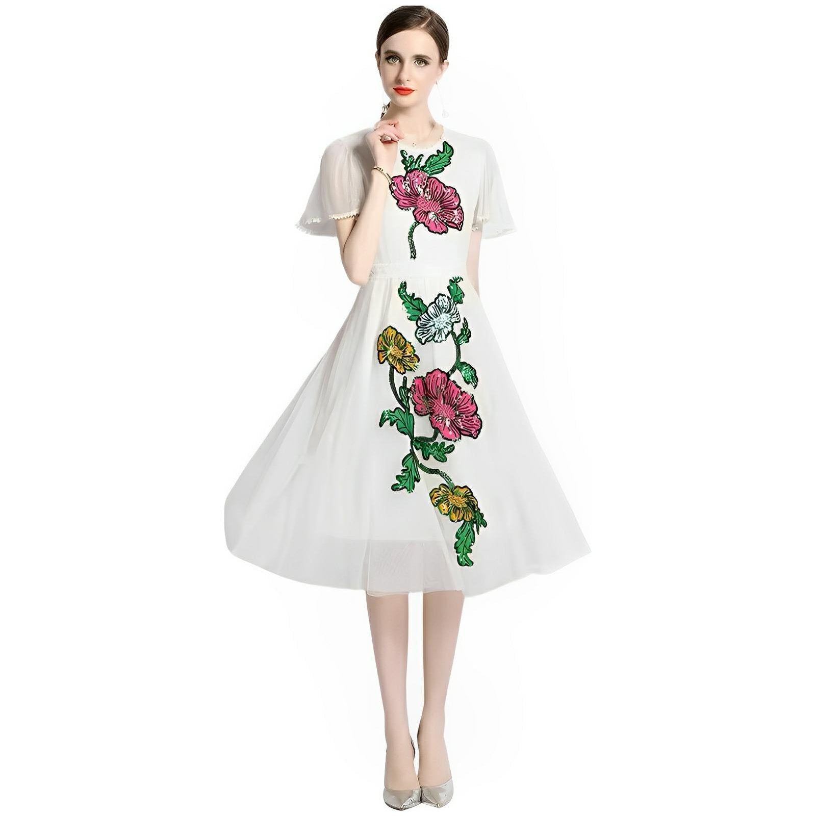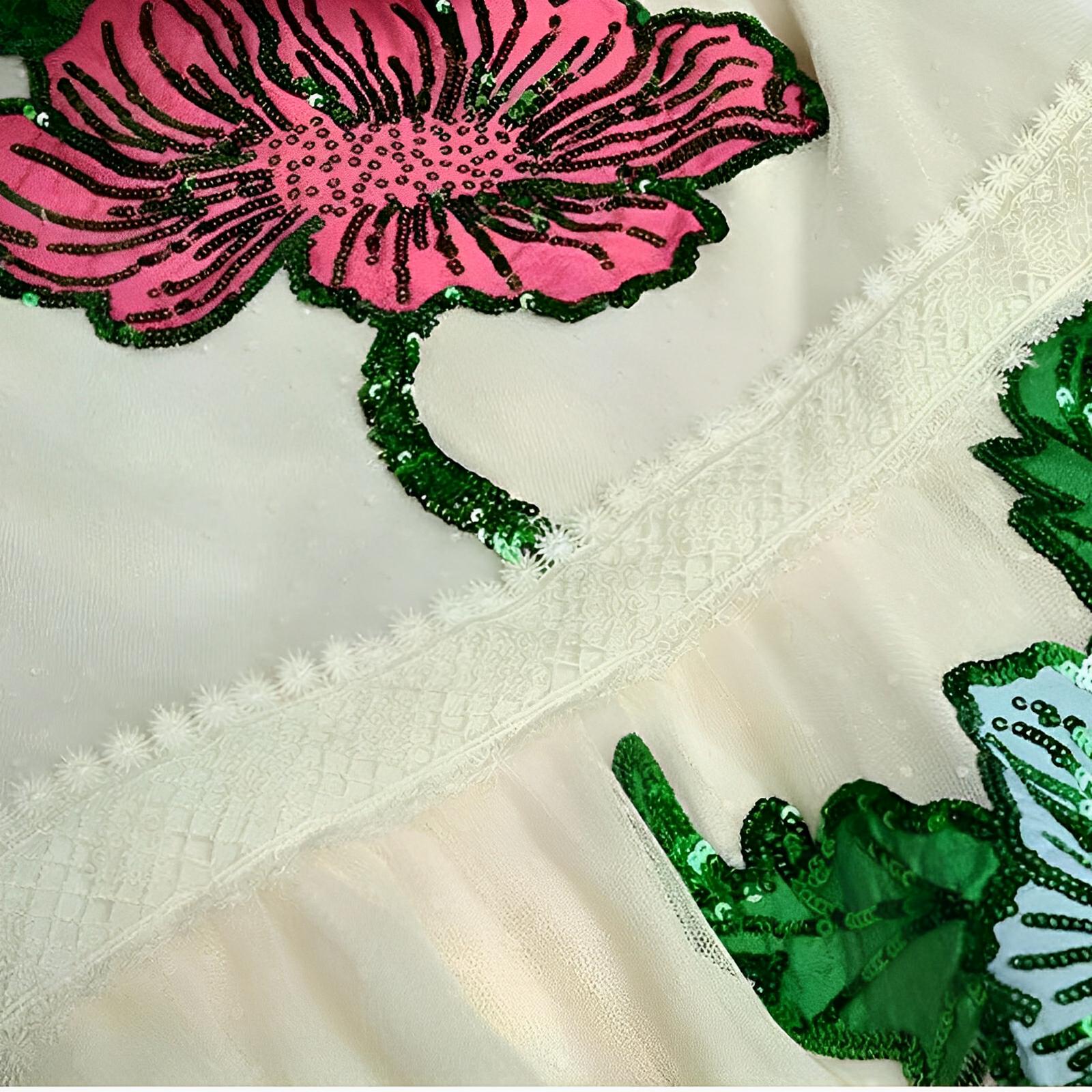 This exquisite dress features elegant short sleeves with intricate sequin florals adorning both the bodice and skirt. Flowing gracefully to a mid-length hem, the skirt is embellished with more floral motifs and delicate lace trim at the base, lending an ethereal quality. This dress is perfect for formal occasions, adding a romantic touch to any event. Be unforgettable.
