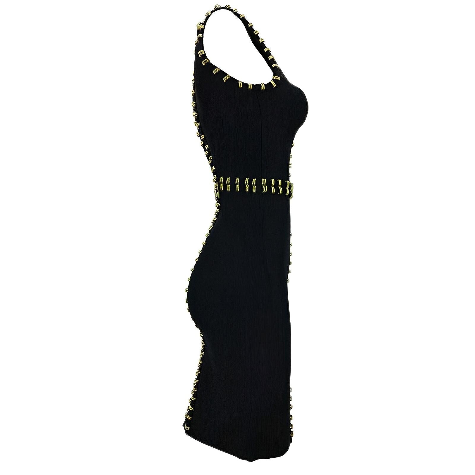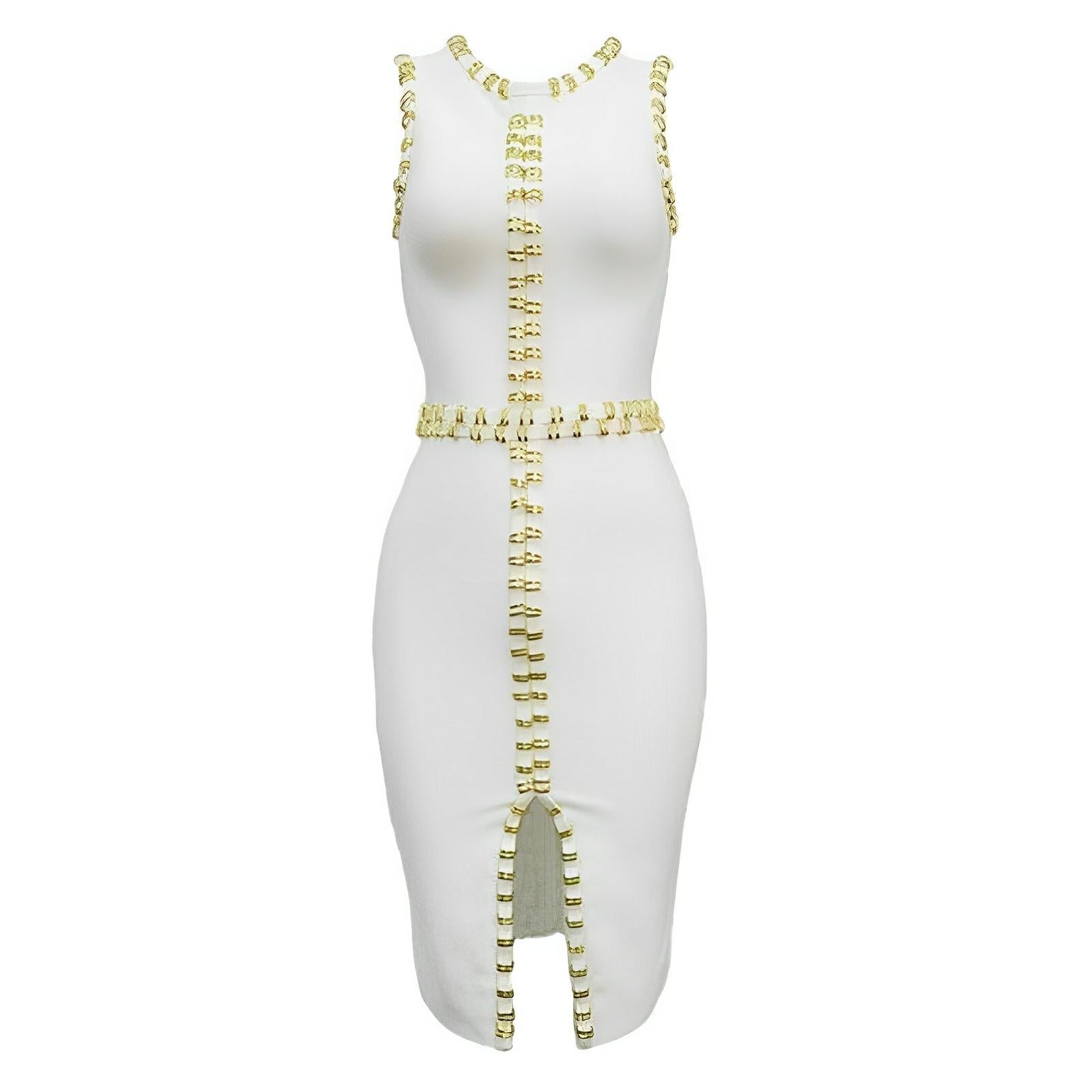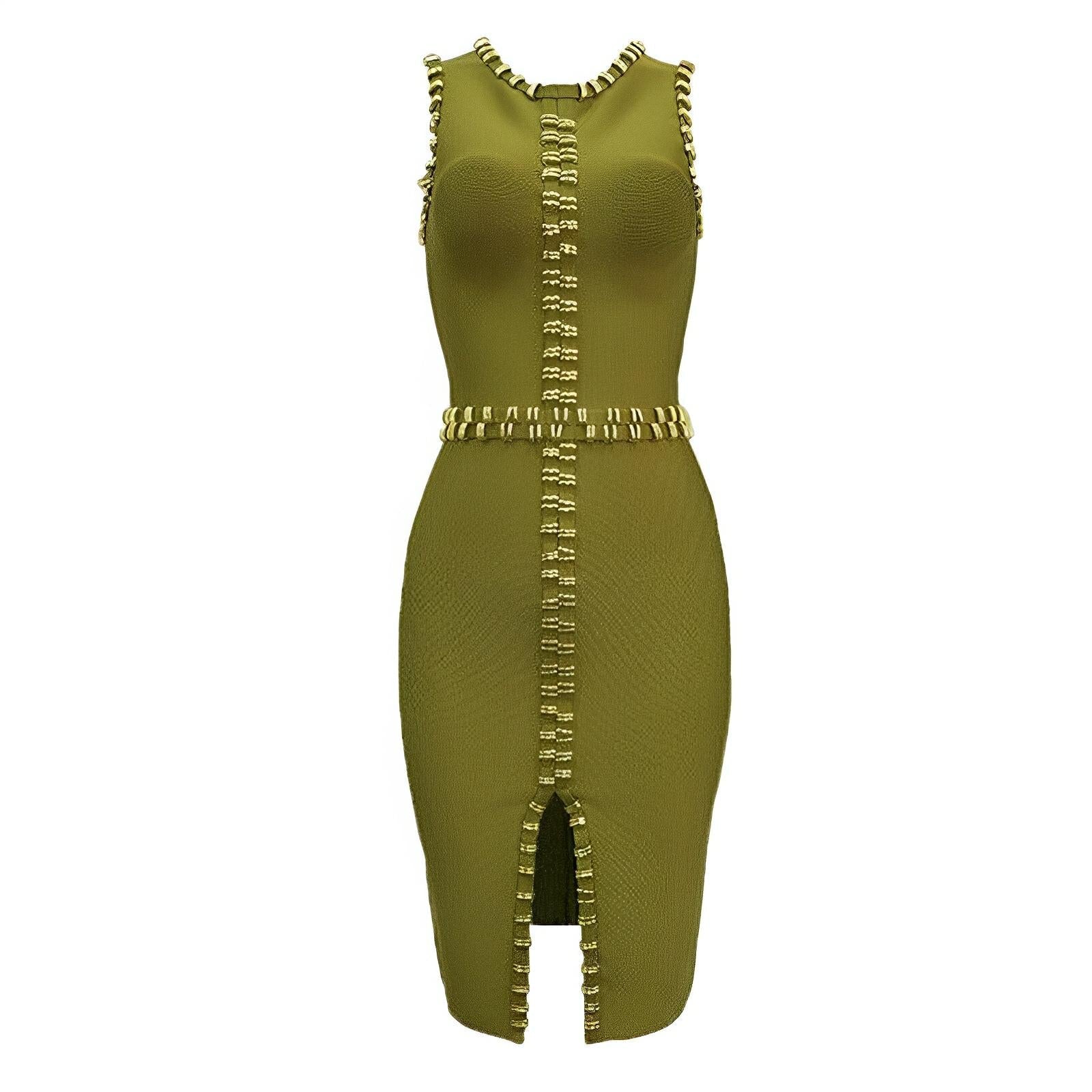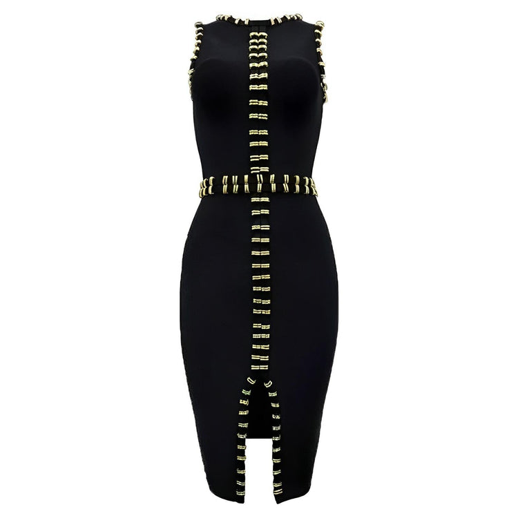 This form-fitting dress features a flattering silhouette, accentuated with accent rivets for an elegant finish. The dress is tailored to enhance the body shape, making it suitable for both casual and semi-formal occasions. The hem rests gracefully above-the-knee, adding a fashionable touch to the overall sleek look. Embrace your allure.