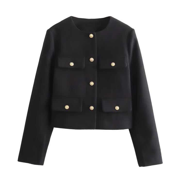 This jacket features luxurious detailing that combines elegance with a contemporary flair. It has accent gold buttons and is designed with a cropped hem, adding a touch of modern sophistication. The jacket has tailored long sleeves, providing a structured silhouette that is perfect for both casual and semi-formal occasions. Command presence.