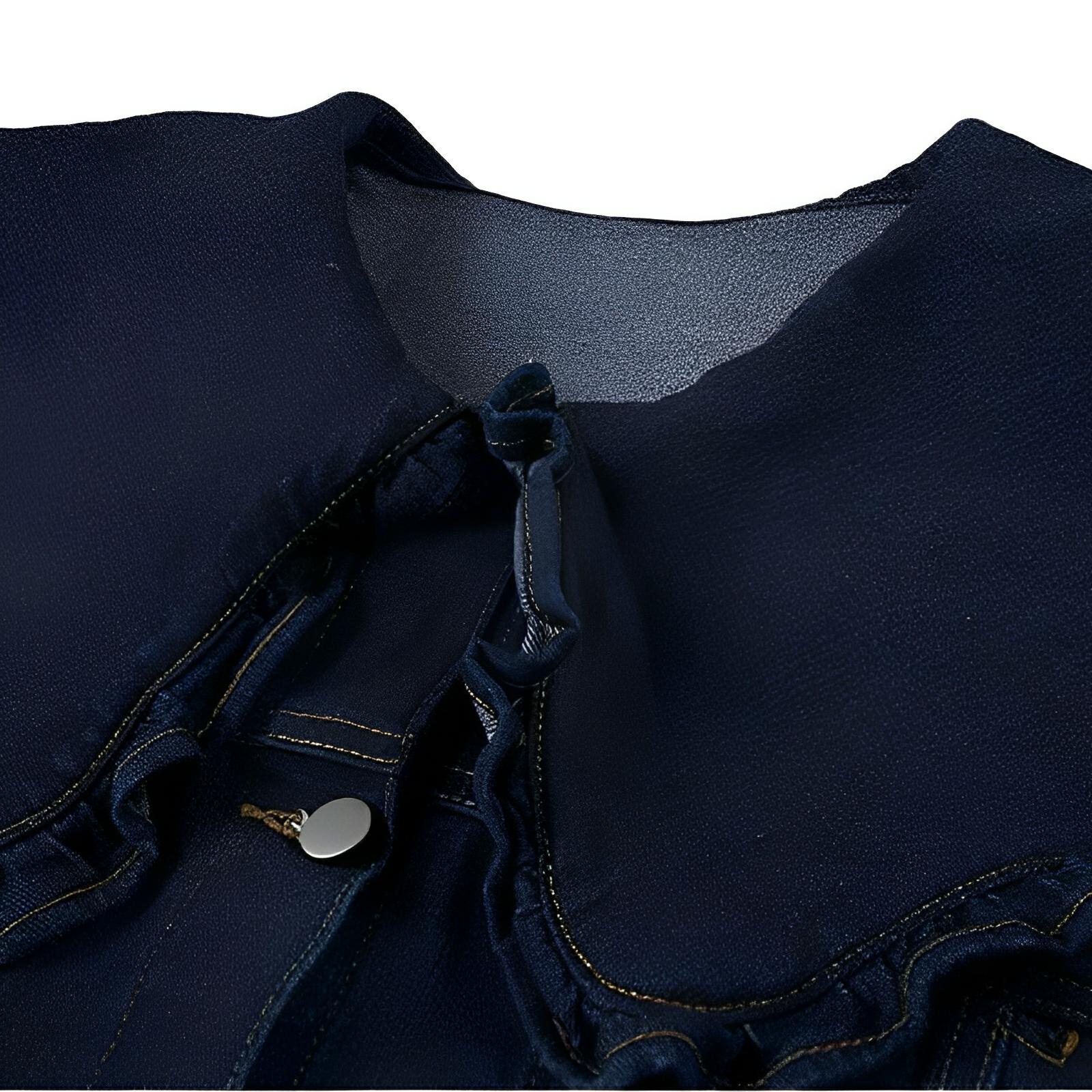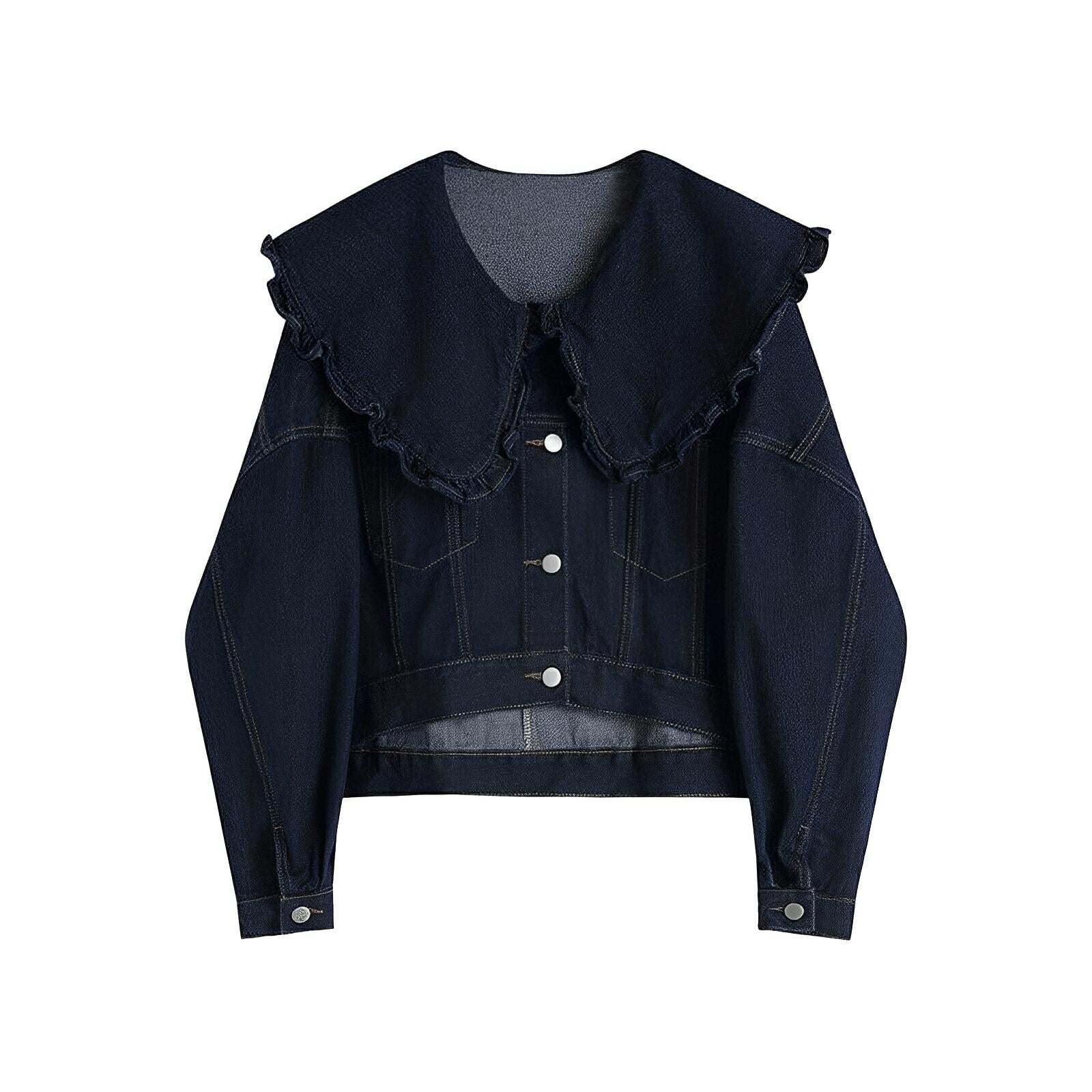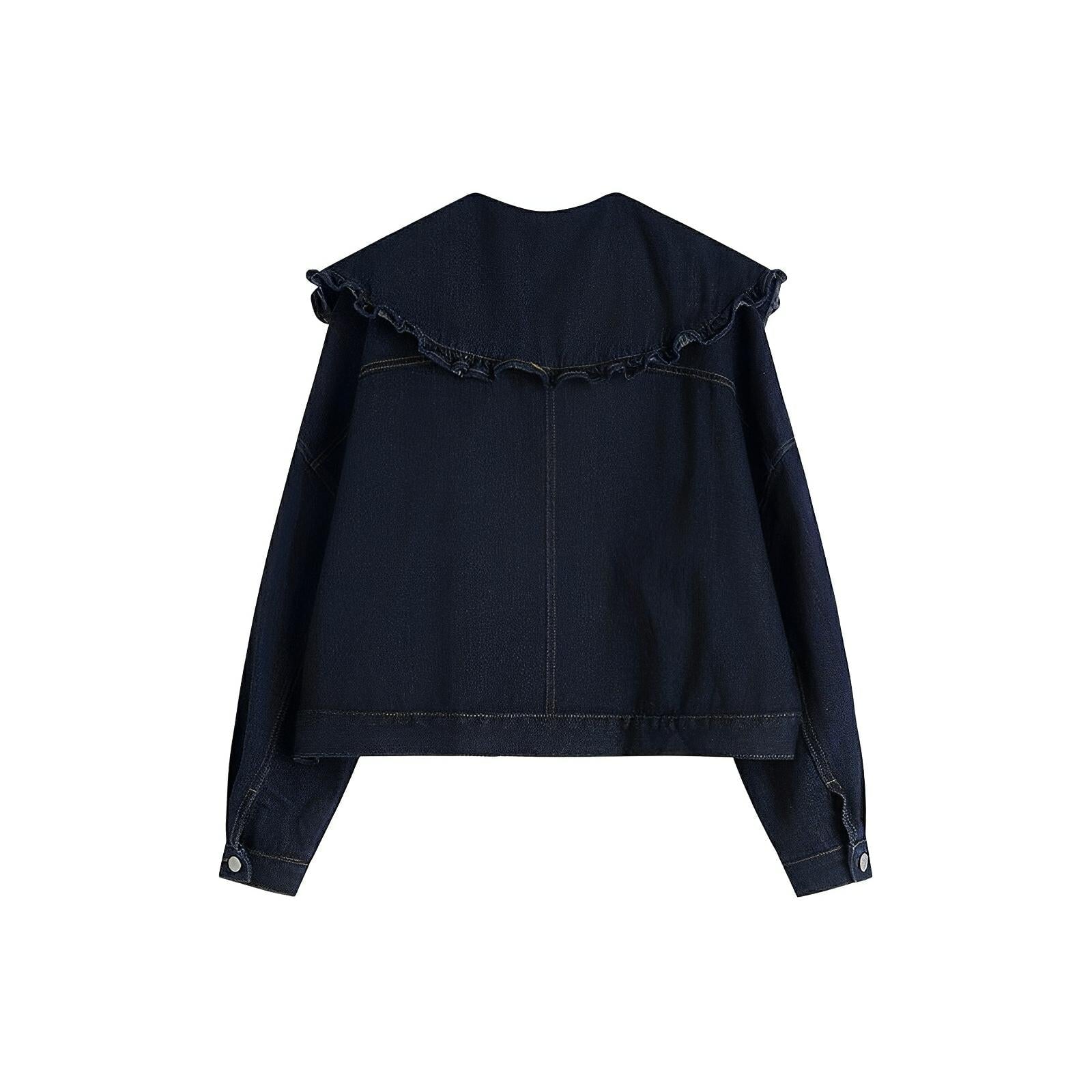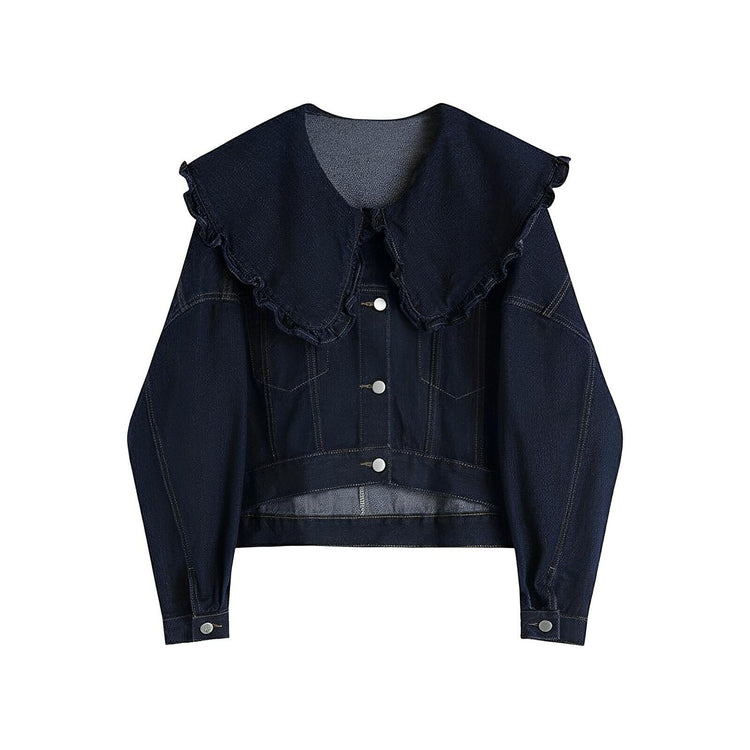 This chic jacket is crafted from a premium denim fabric, showcasing a subtle texture with a slightly faded finish, giving it a vintage-inspired appeal. It has a front button closure with metallic buttons and tailored seams, enhancing its structured silhouette. The frilled collar adds a contemporary flair, making it ideal for casual or semi-formal occasions. Make a statement.
