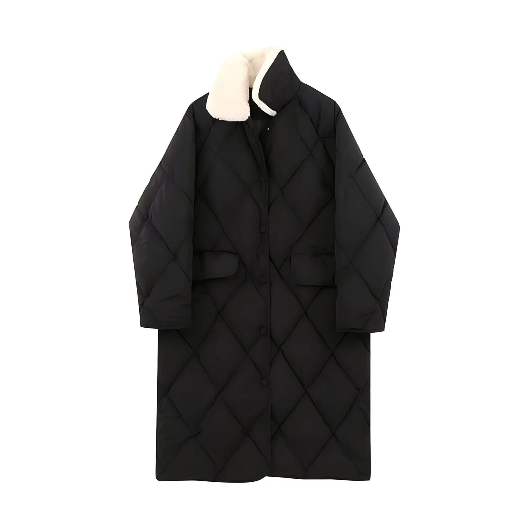 This oversized, long puffer coat features a distinctive quilted pattern, providing both style and insulation. The long sleeves are slightly wide, contributing to the relaxed fit, making it suitable for casual outings as well as colder weather. This coat is perfect for adding warmth while maintaining a chic appearance. Leave your mark.