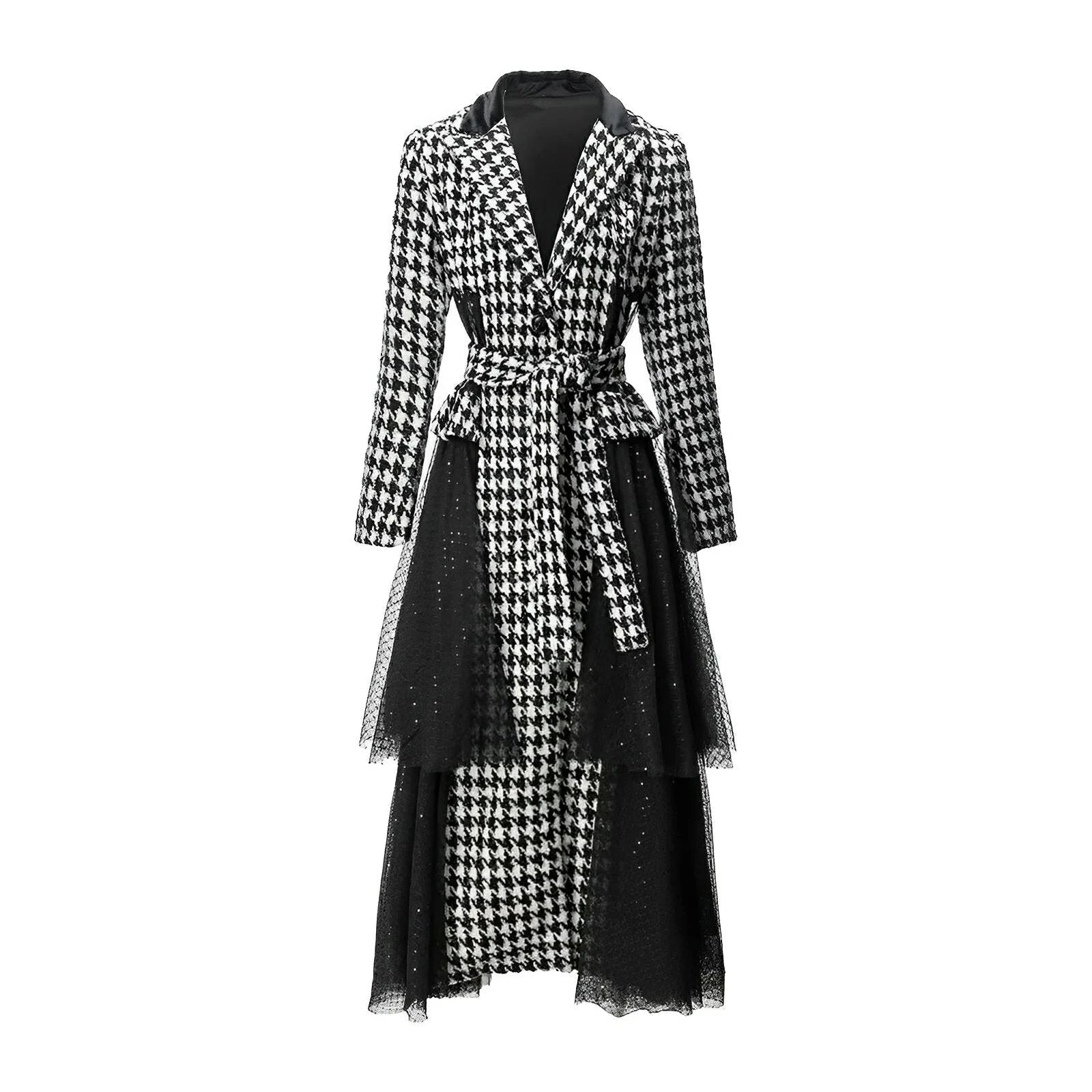 This luxurious coat features a smooth, herringbone fabric that offers a stylish take on traditional outerwear. The coat has a tasteful lapel collar, and a tailored fit, accentuating the overall silhouette. The coat falls to a mid-length, making it versatile for both formal and fashion-forward occasions, easily pairing with various outfits. Define your presence.
