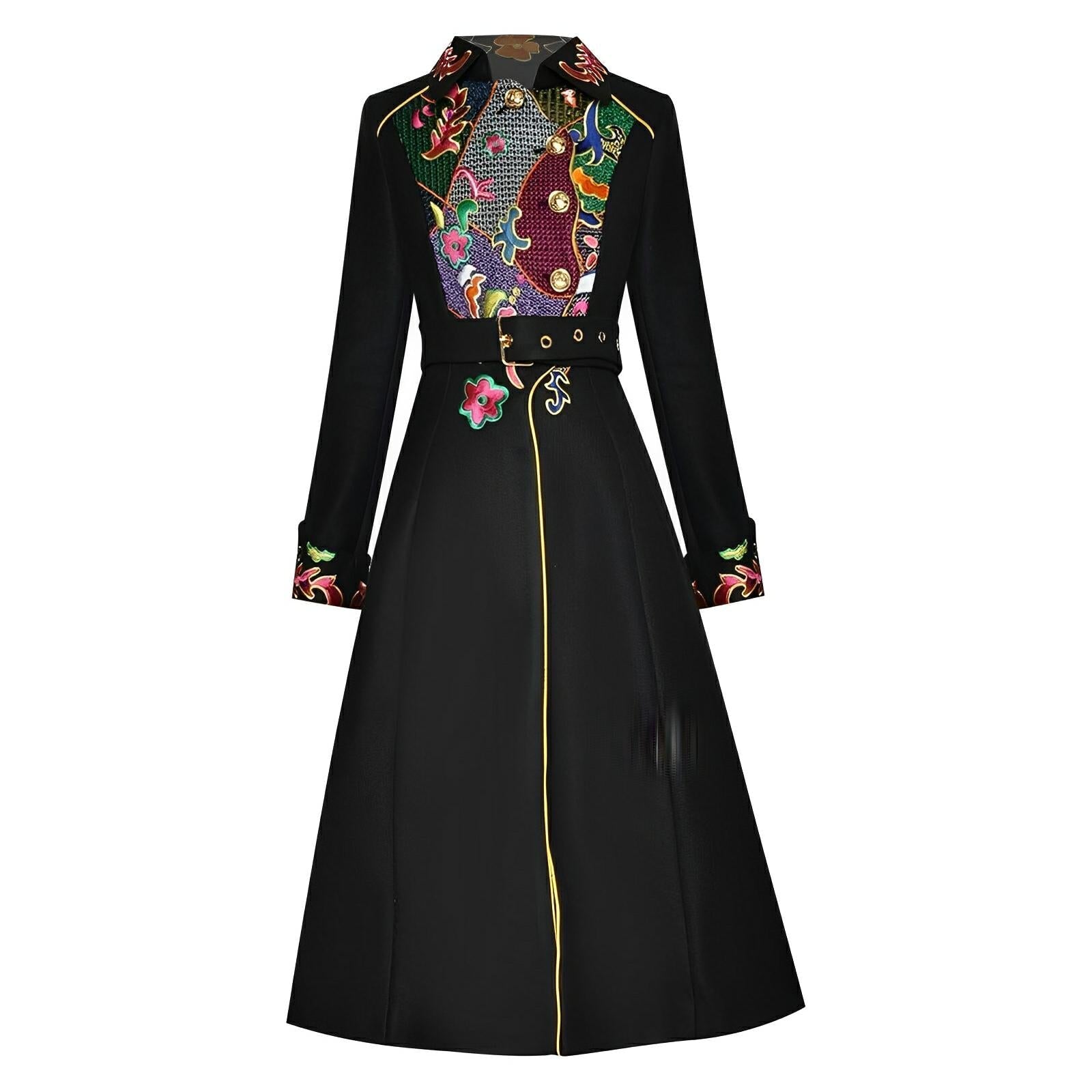 This stylish long coat features luxurious fabric with embroidered detailing, adding texture and depth to the overall design. It is cinched at the waist with a wide belt, enhancing the coat's elegant appeal. The overall design balances timeless elements with modern accents, making it suitable for both formal and casual occasions. Leave a lasting impression.
