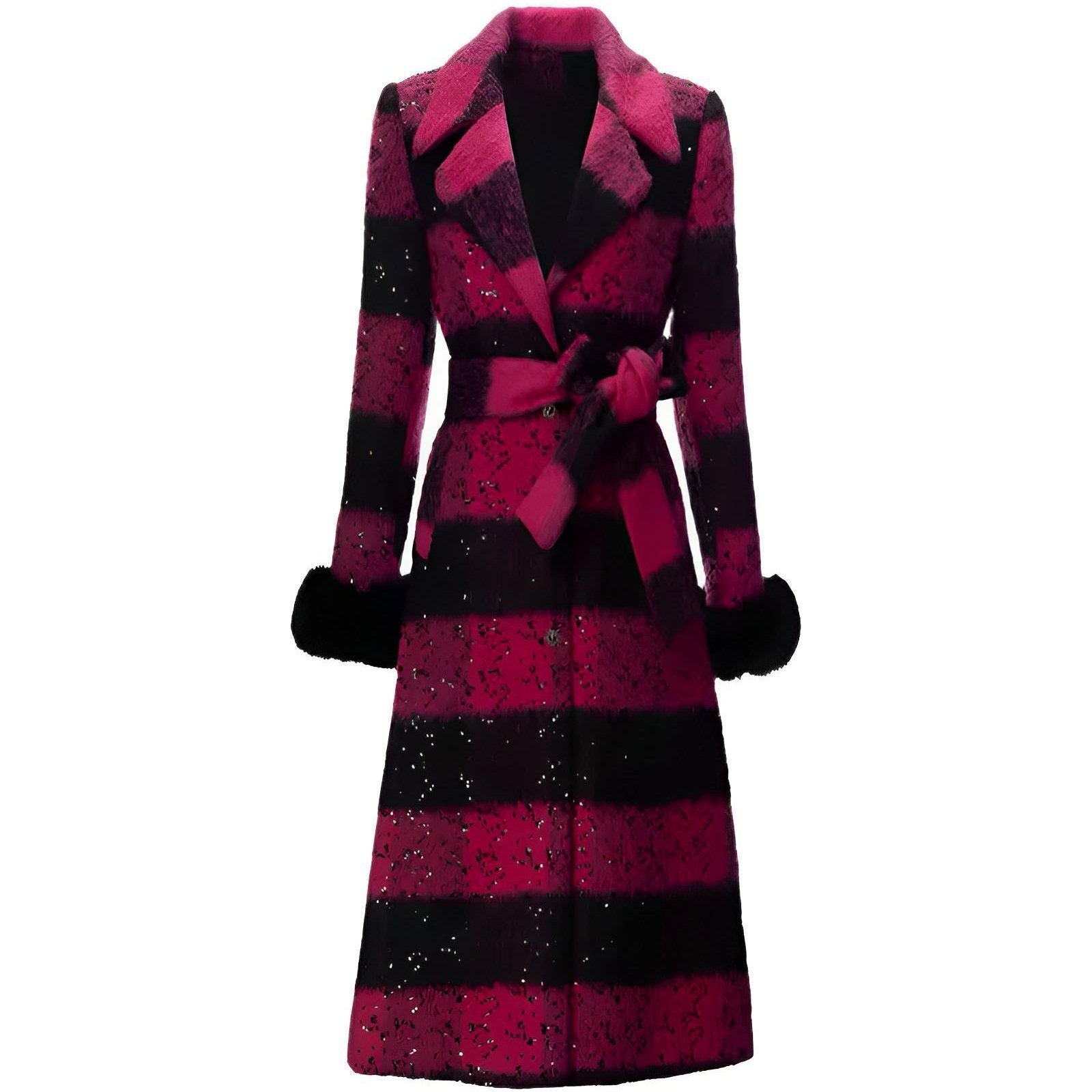 This stylish longline coat features luxurious fabric with subtle sequin detailing, adding texture and depth to the overall design. It is cinched at the waist with a wide belt, enhancing the coat's elegant appeal. The overall design balances timeless elements with modern accents, making it suitable for both formal and casual occasions. Leave a lasting impression.