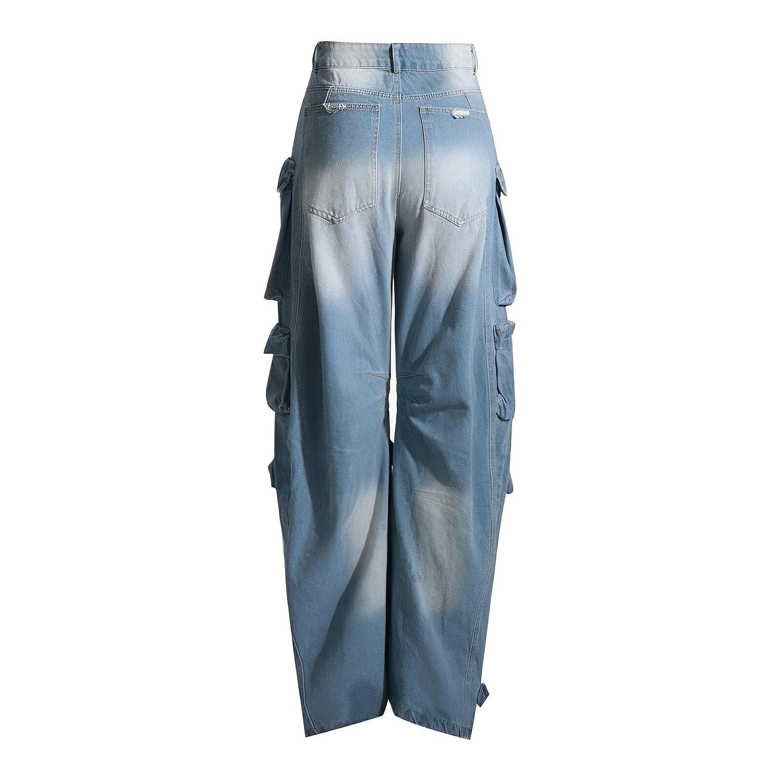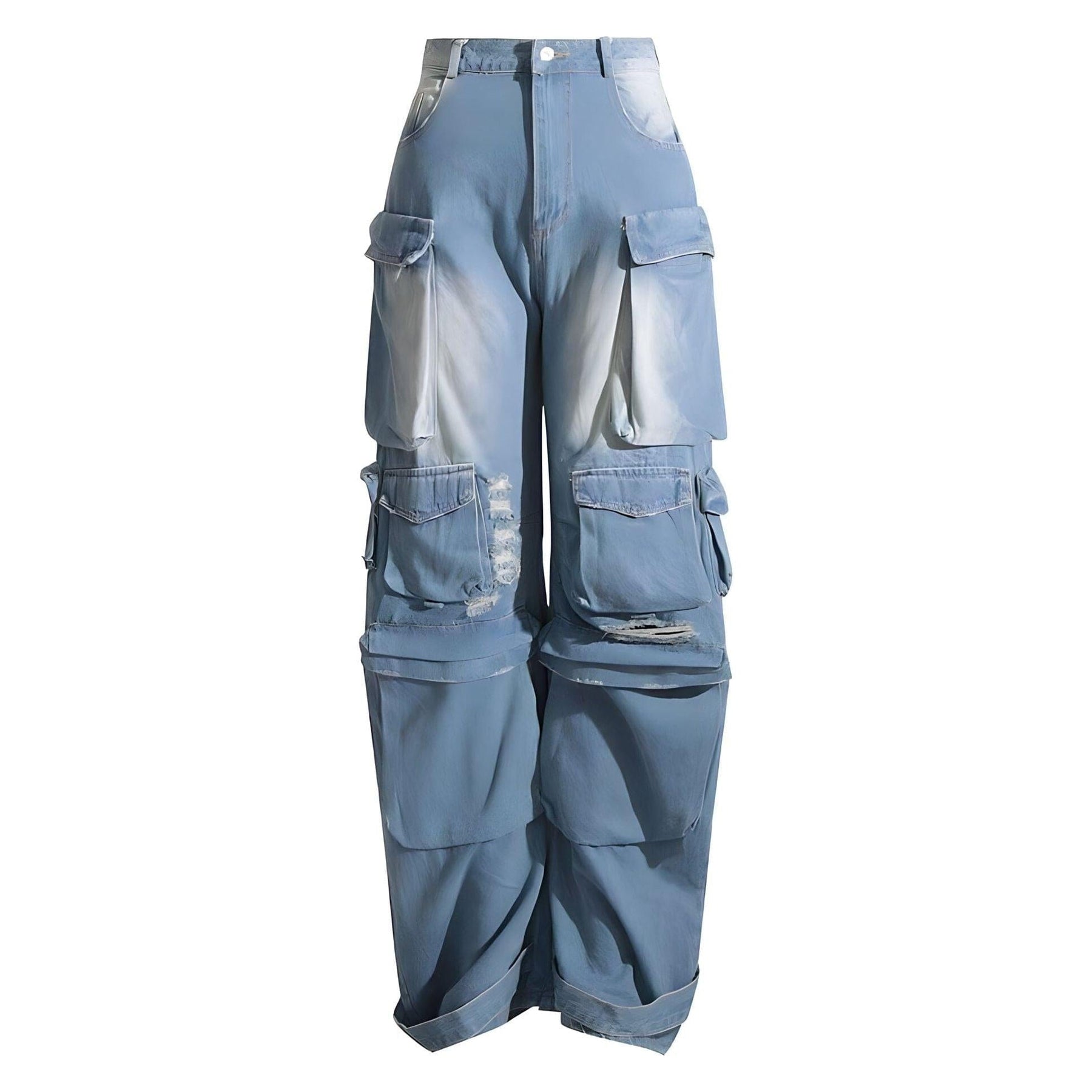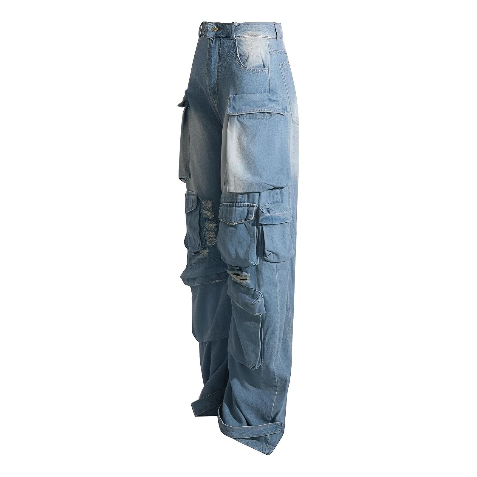 These high-waisted denim cargo pants feature unique exterior detailing for a bold finish. The fabric has a slight texture with fading details, giving it a vintage appeal. Ideal for casual outings or fashion-forward events, these bottoms combine comfort with a statement aesthetic. Be unforgettable.