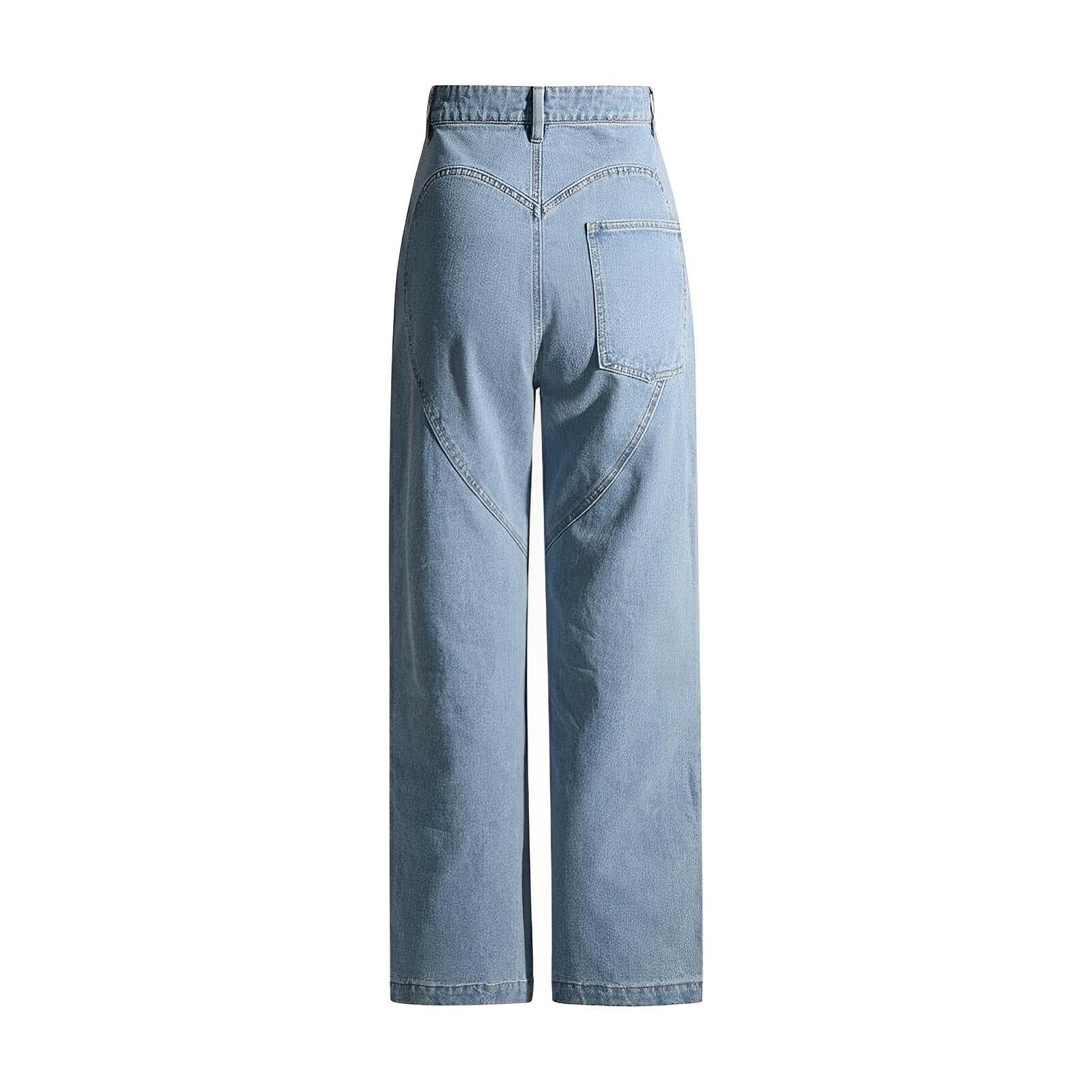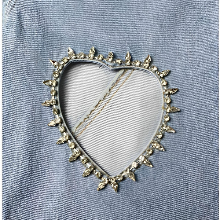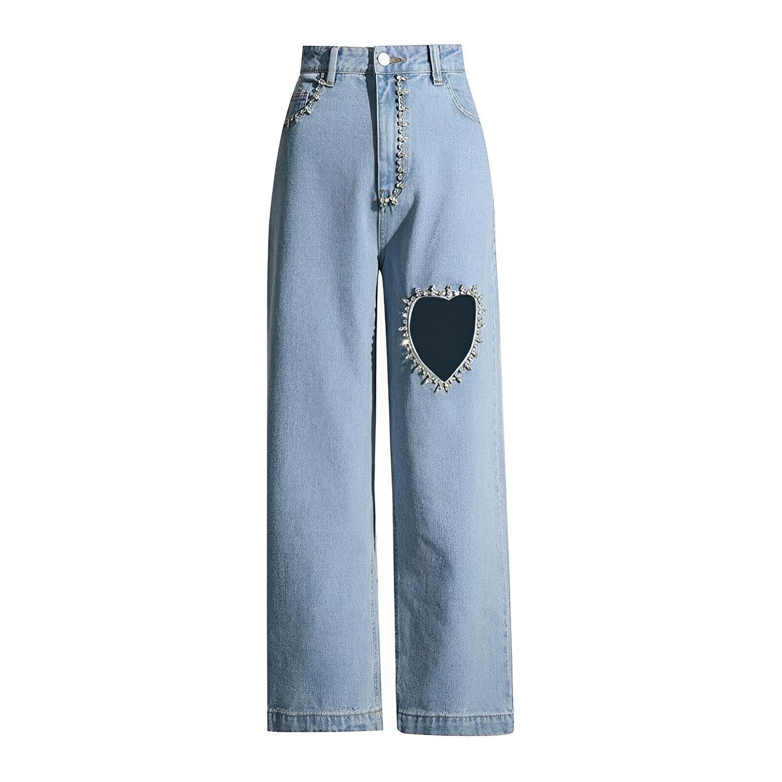 These high-waisted jeans feature unique rhinestone detailing for a bold finish. The denim has a light blue wash with subtle fading, adding a worn-in look. Ideal for casual outings or fashion-forward events, these jeans combine comfort with a statement aesthetic. Be unforgettable.