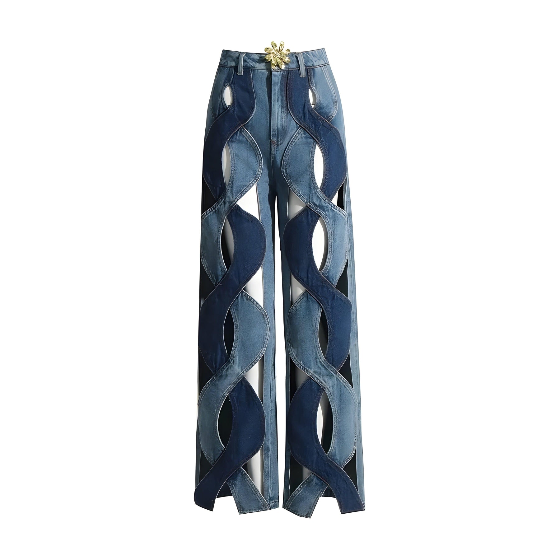 These high-waisted, wide-leg jeans feature unique perforations for a bold finish. The denim has a gradient wash with subtle fading, adding a worn-in look. Ideal for casual outings or fashion-forward events, these jeans combine comfort with a statement aesthetic. Be unforgettable.