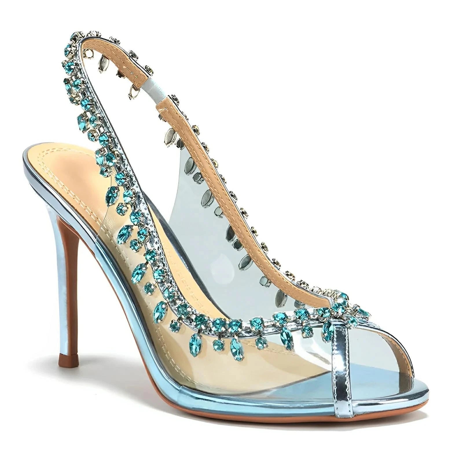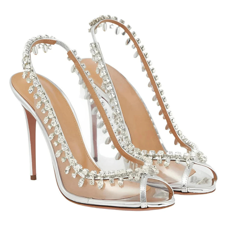 These brilliant heels showcase a sleek, open-toe design with a luxurious rhinestone finish. The combination of meticulous craftsmanship, and detailed styling, make this shoe a statement piece ideal for fashion-forward events or night outings. The overall silhouette is opulent yet modern, perfect for those looking to make an unforgettable impression. Be remembered.