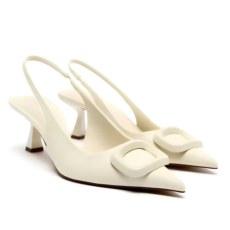 These stylish heels showcase a sleek, pointed toe design with a luxurious buckle finish. The combination of meticulous craftsmanship, and detailed styling, make this shoe a statement piece ideal for fashion-forward events or night outings. The overall silhouette is sophisticated yet modern, perfect for those looking to make an unforgettable impression. Be remembered.