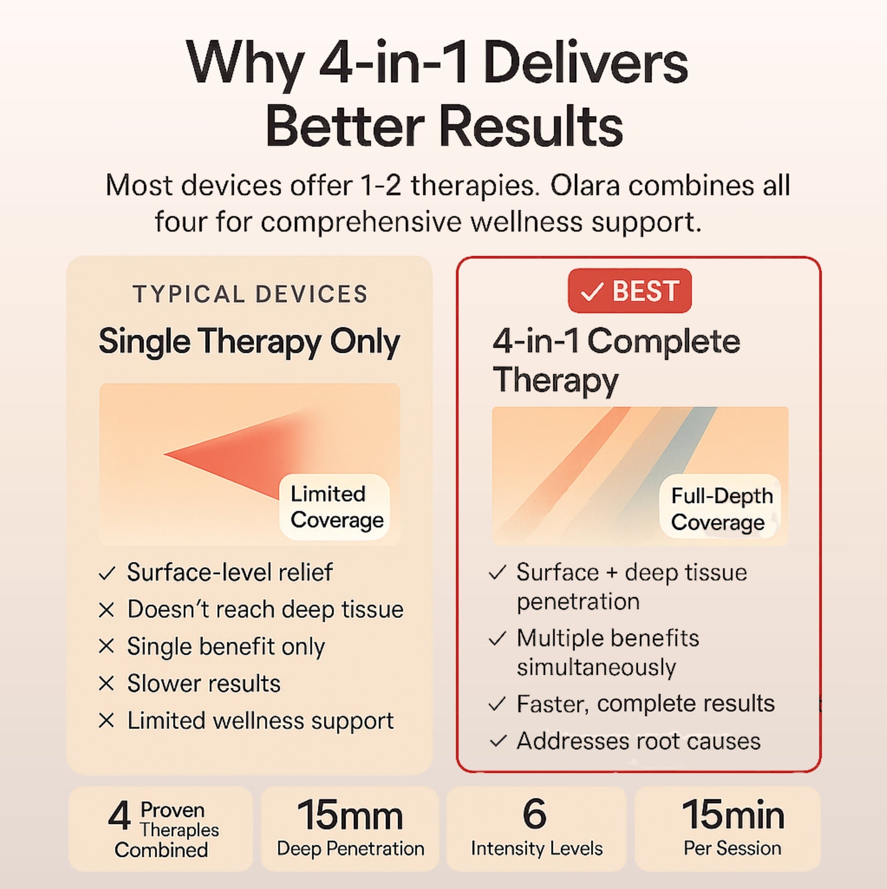 The Olara Infrared Massage Belt combines four proven therapies in one device: 660nm red light + 850nm infrared, therapeutic heat, and EMS micro-pulse massage.