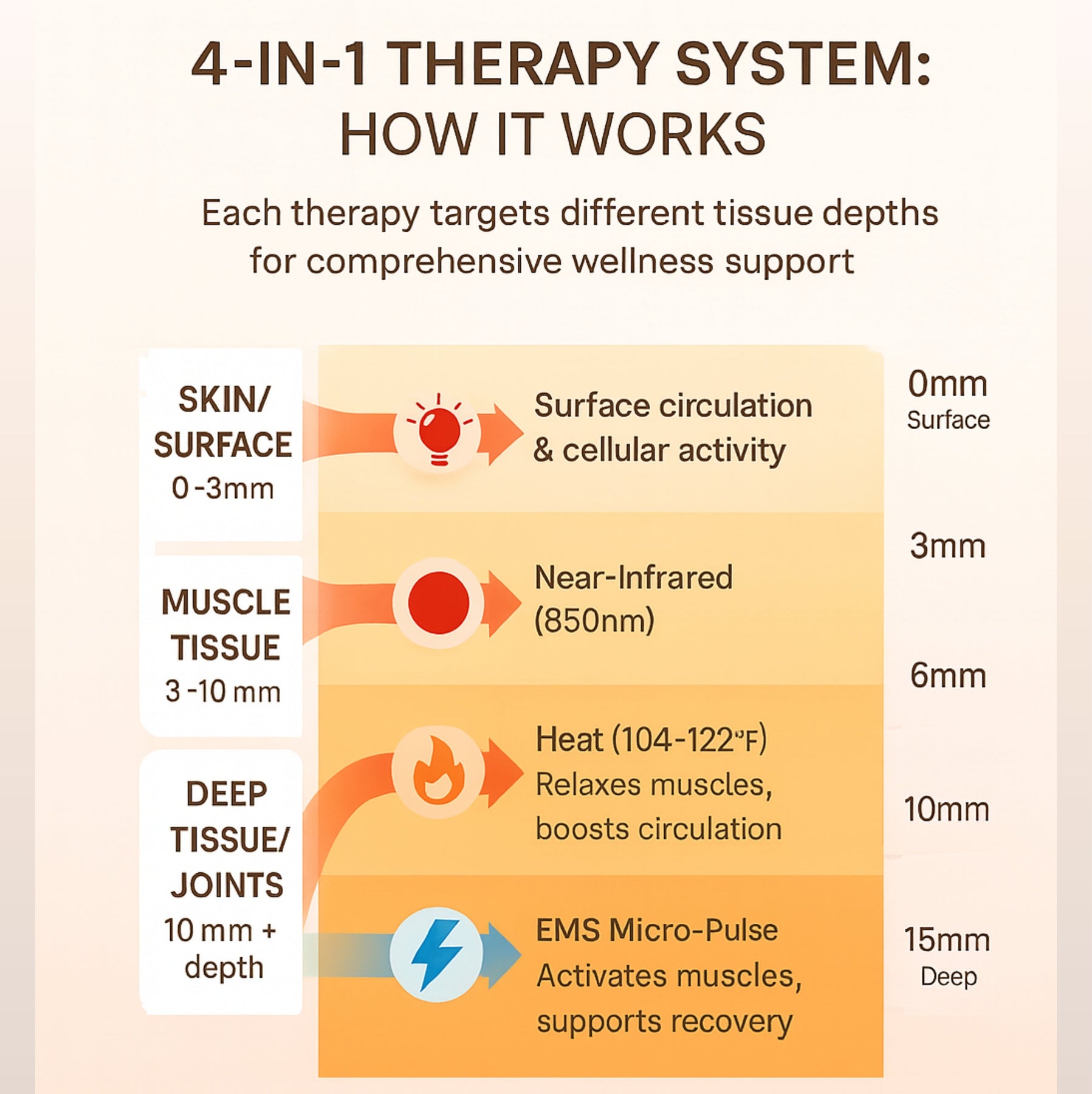 • True 4-in-1 System — Red light + infrared + heat + EMS massage (most competitors offer only 1–2)