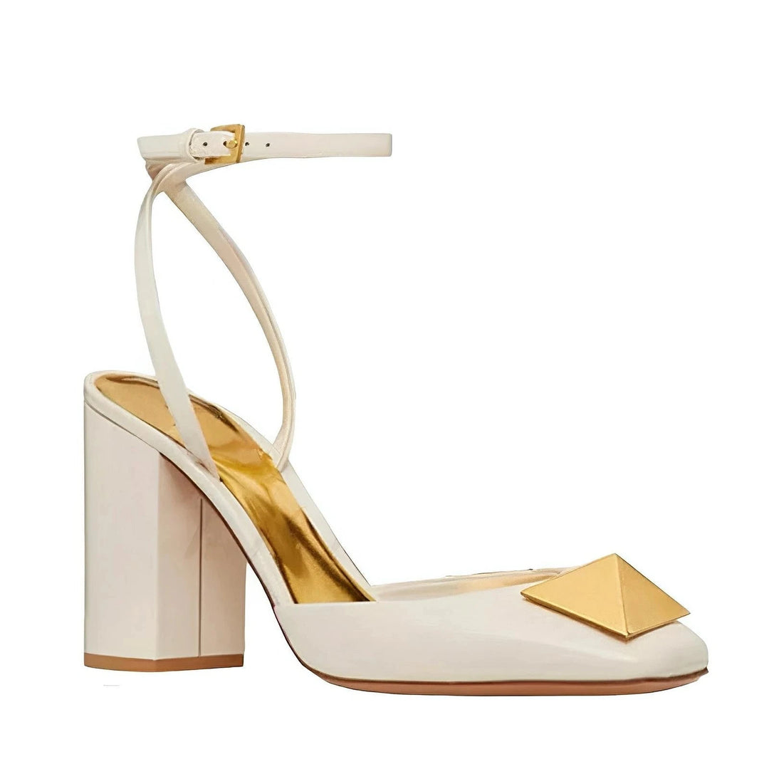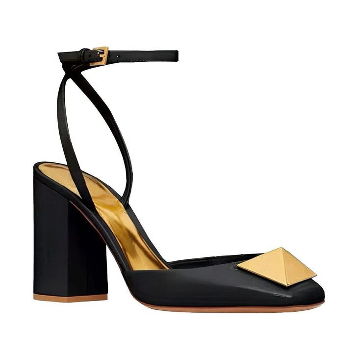 This stylish high-heeled shoe features a luxurious upper, elegantly designed with gold appliqués. The shoe has a secure ankle strap with a delicate buckle, offering both style and support. Overall, this piece embodies a blend of opulence and charm, making it perfect for special occasions or a fashion-forward statement. Step into distinction.