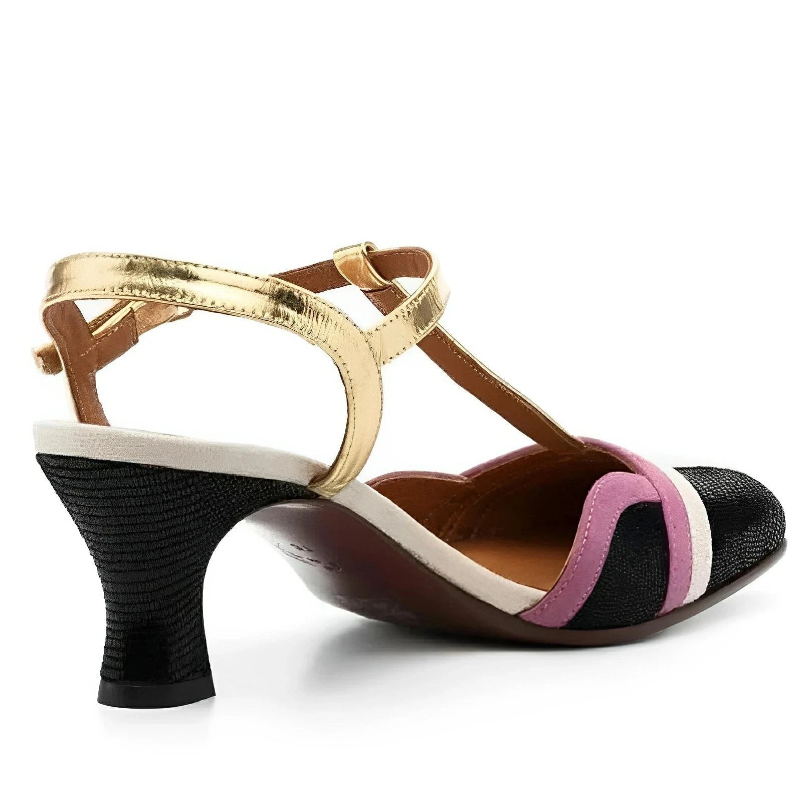 This sophisticated high-heeled shoe features a luxurious upper, elegantly designed with intricate contrast detailing. The shoe has a secure ankle strap with a delicate buckle, offering both style and support. Overall, this piece embodies a blend of opulence and charm, making it perfect for special occasions or a fashion-forward statement. Step into distinction.