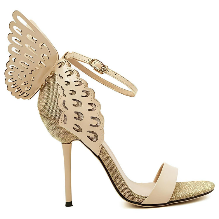 This captivating high-heeled shoe features a luxurious upper, elegantly designed with intricate butterfly motifs. The shoe has a secure ankle strap with a delicate buckle, offering both style and support. Overall, this piece embodies a blend of opulence and charm, making it perfect for special occasions or a fashion-forward statement. Step into distinction.