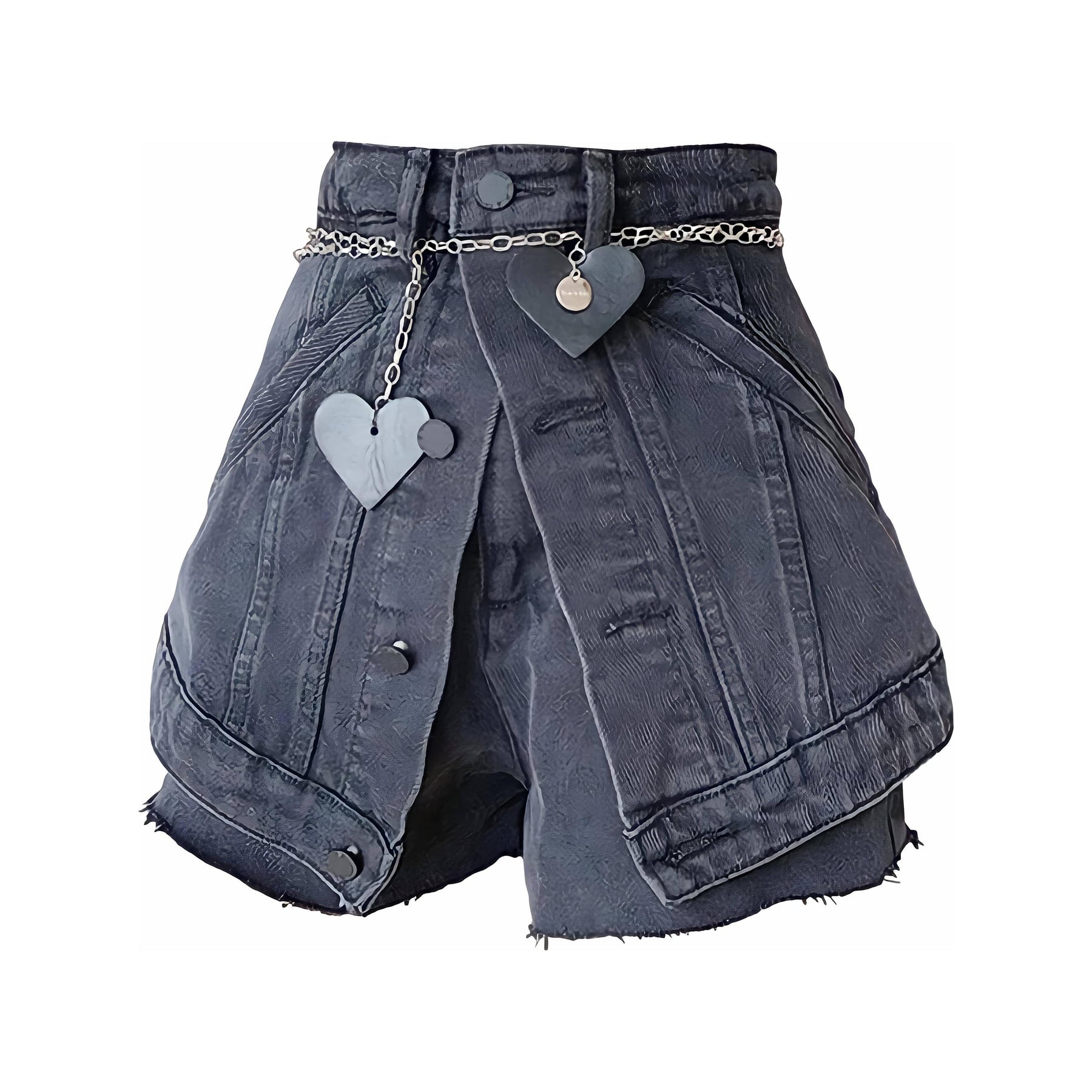 These high-waisted denim shorts feature a vintage wash showcasing unique 'heart' detailing for a trendy, edgy aesthetic. A front button closure and traditional five-pocket design enhance their classic denim style. The overall fit is relaxed, making them perfect for casual outings or a festival-inspired look. Accentuate your allure.