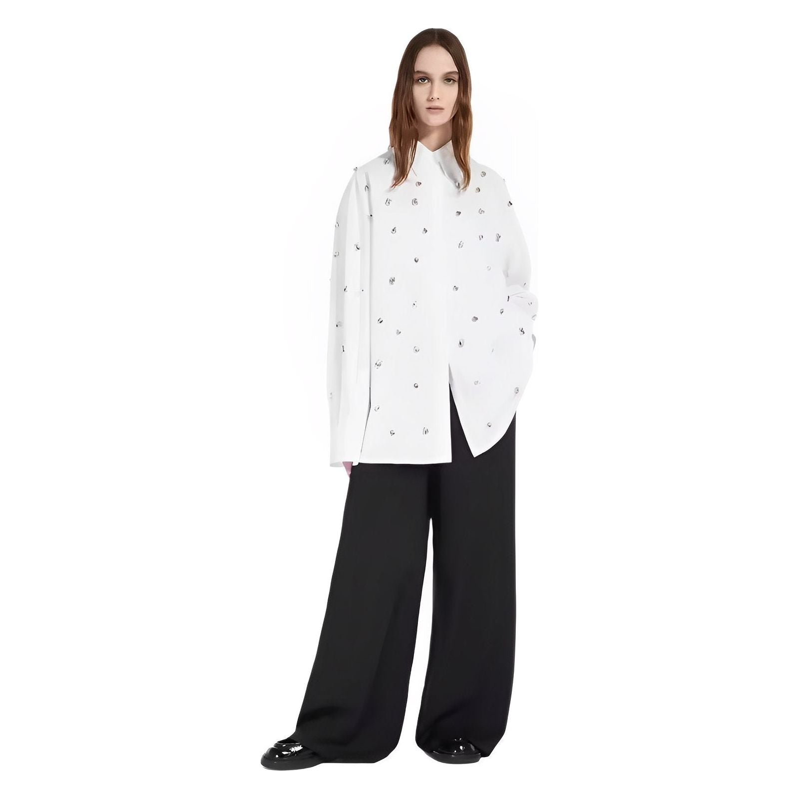 Studded top with a smooth, soft texture that offers a luxurious feel. The overall fit is modern and slightly relaxed, enhancing the silhouette for a contemporary look that blends comfort with a touch of sophistication. Leave a lasting impression.
