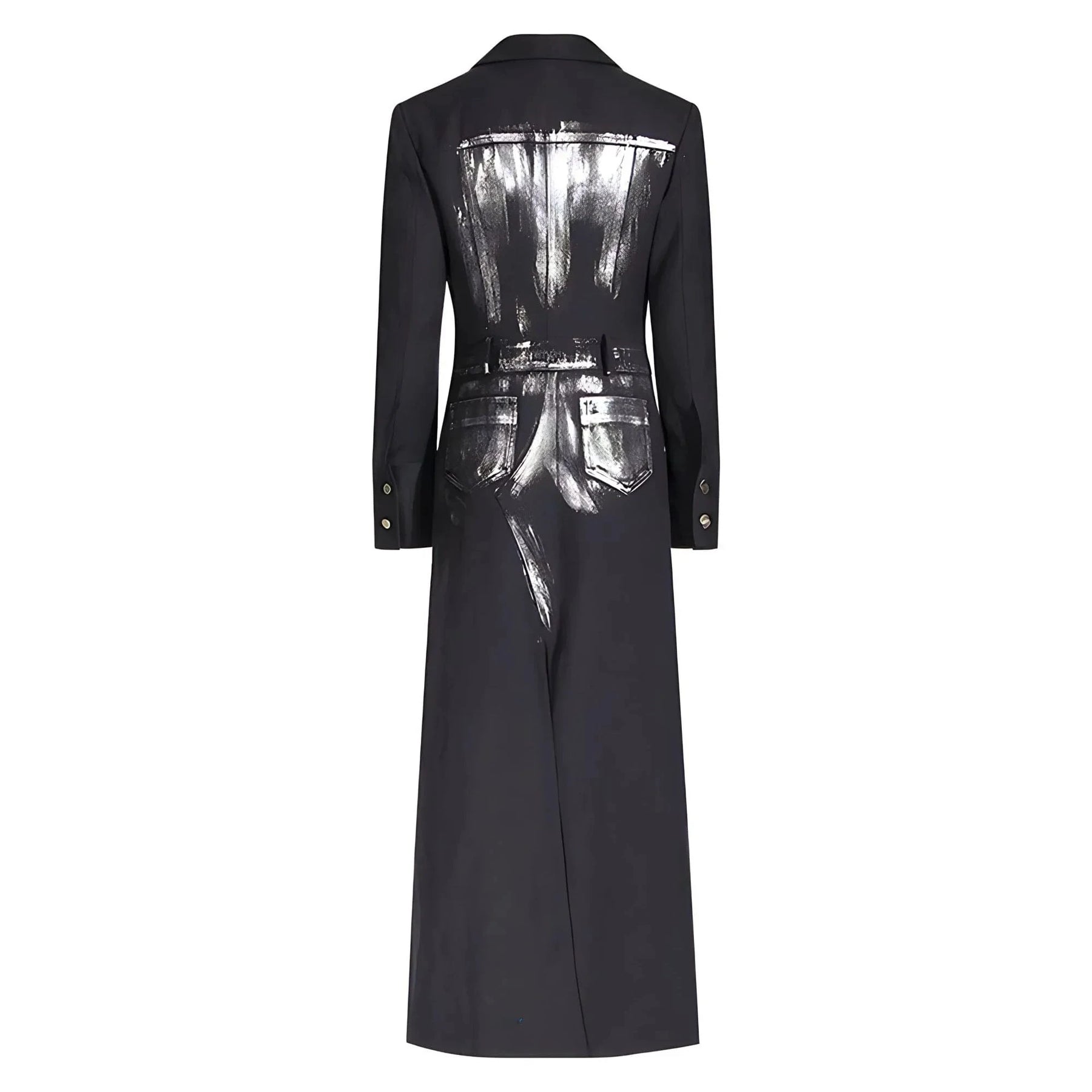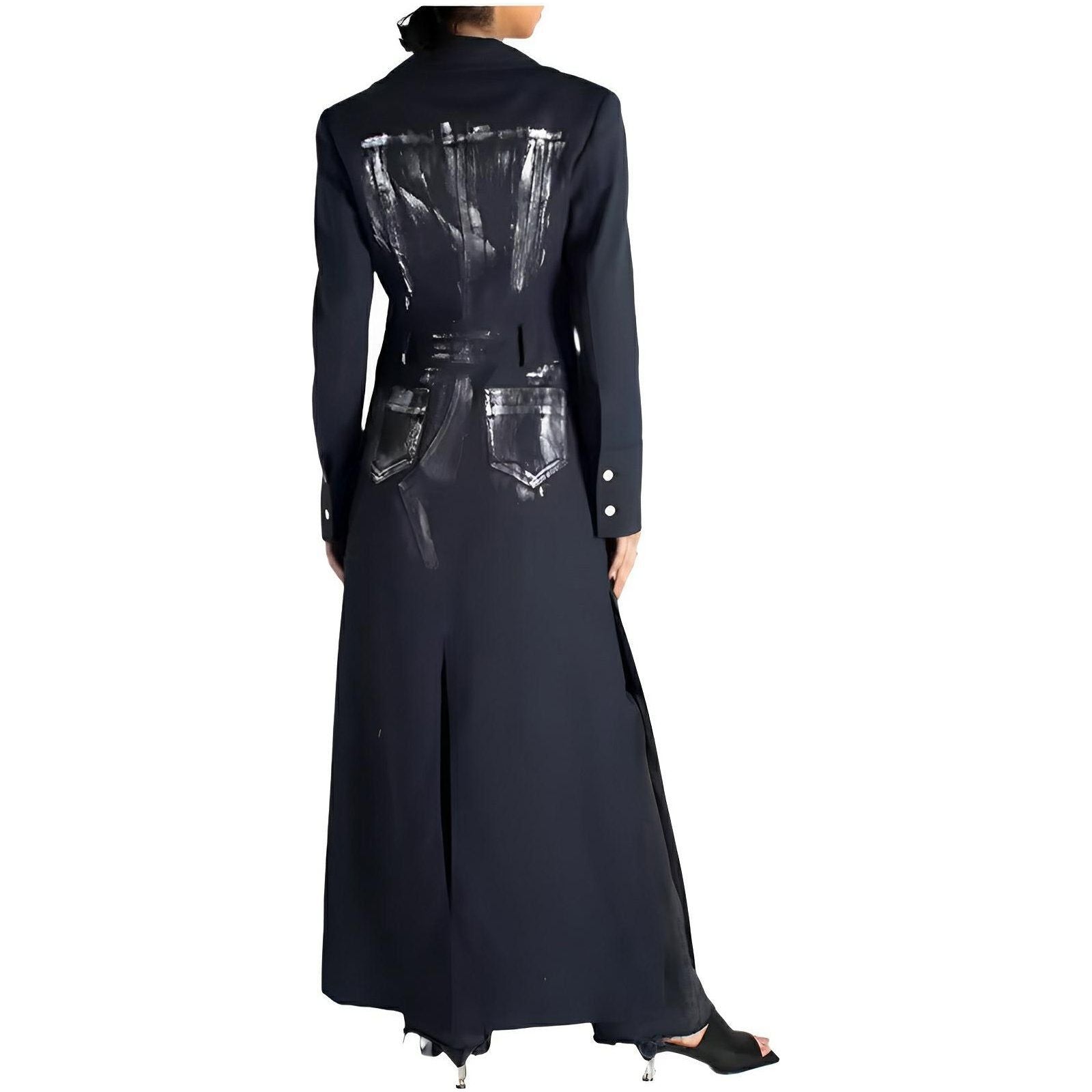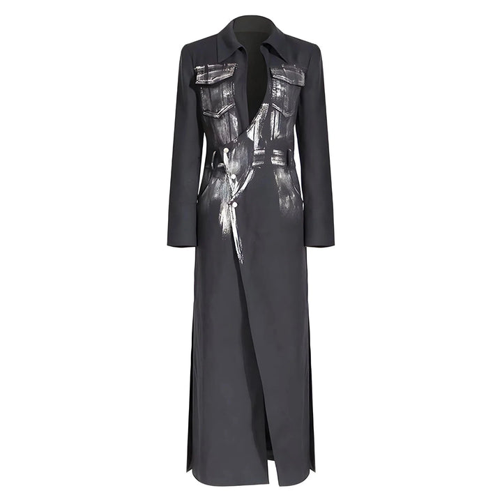 This sophisticated coat features a smooth, detailed fabric that offers a modern take on traditional outerwear. The coat has a tasteful lapel collar, and a tailored fit, accentuating the overall silhouette. The coat falls to a mid-length, making it versatile for both casual and semi-formal occasions, easily pairing with various outfits. Define your presence.