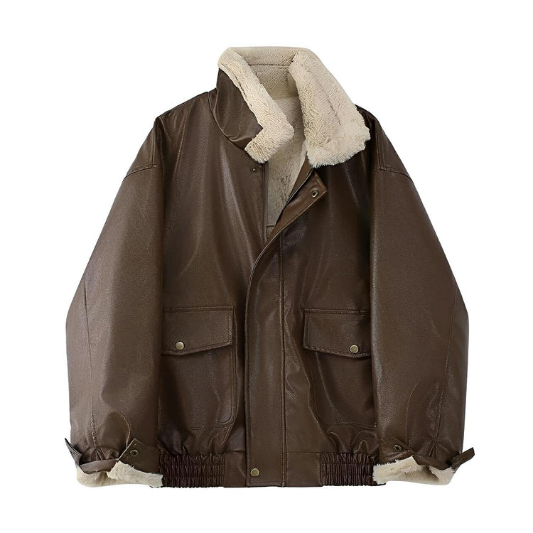 This faux leather jacket features a sleek, textured finish with a distinctive contrast fur collar. The stylish front zip closure adds a contemporary edge, complemented by two utility side pockets for practicality. The overall design exudes a modern, biker-inspired aesthetic, making it suitable for both casual and semi-formal occasions. Leave your mark.